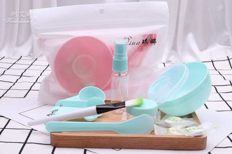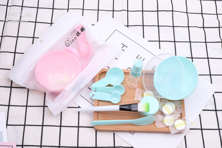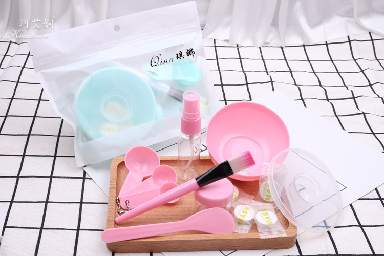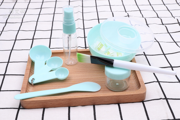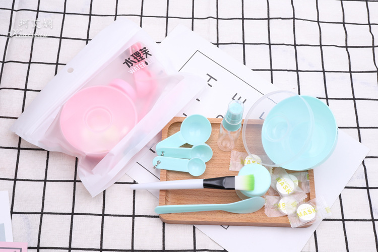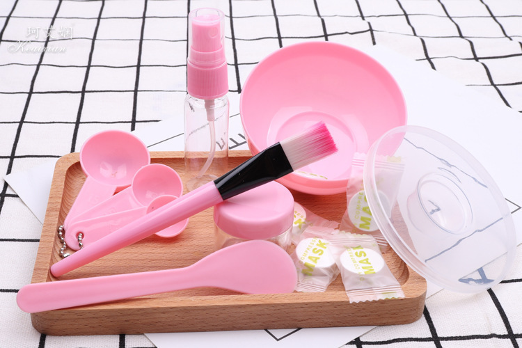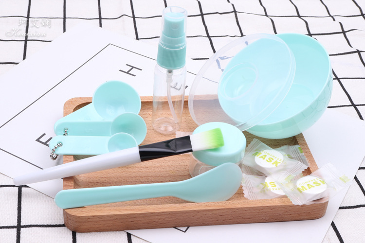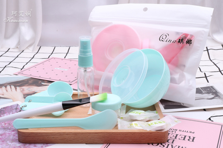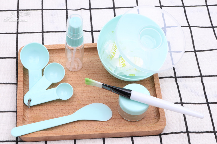 9件套为面膜碗,面膜碗的盖子,棒,面膜刷,计量勺3个,喷瓶、泡瓶,额外加送5颗面膜纸