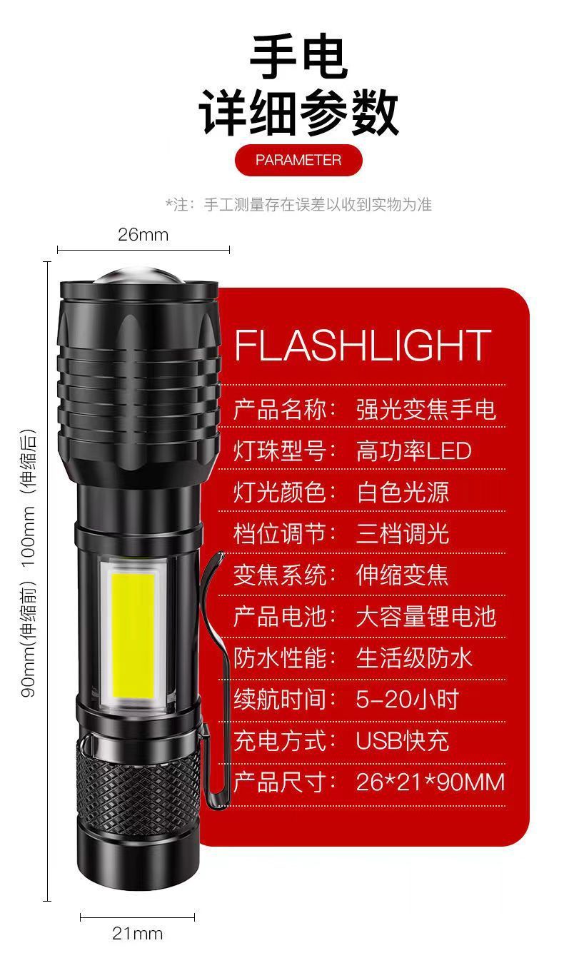 塑料强光手电筒迷你USB充电LED超亮家用户外照明变焦强光伸缩便携 投诉