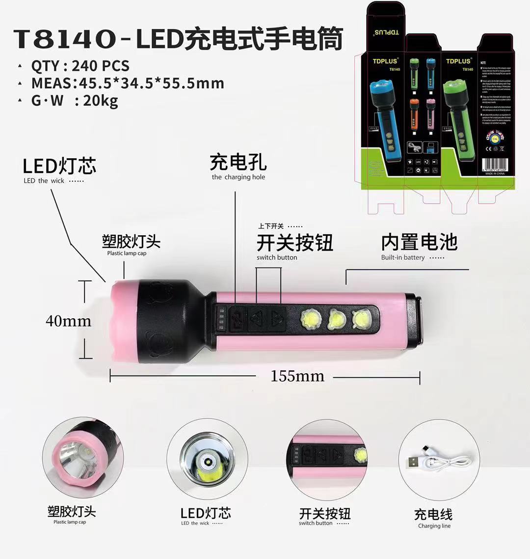跨境新款LED强光手电筒可USB充电带侧灯户外家用工作灯便携探照灯 投诉
