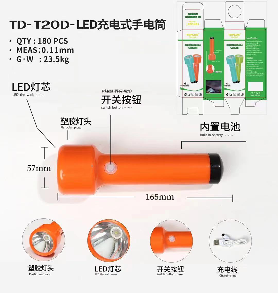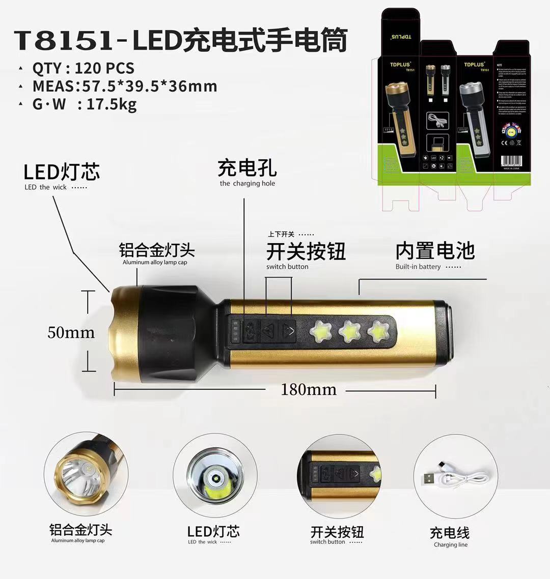跨境新款LED强光手电筒可USB充电带侧灯户外家用工作灯便携探照灯