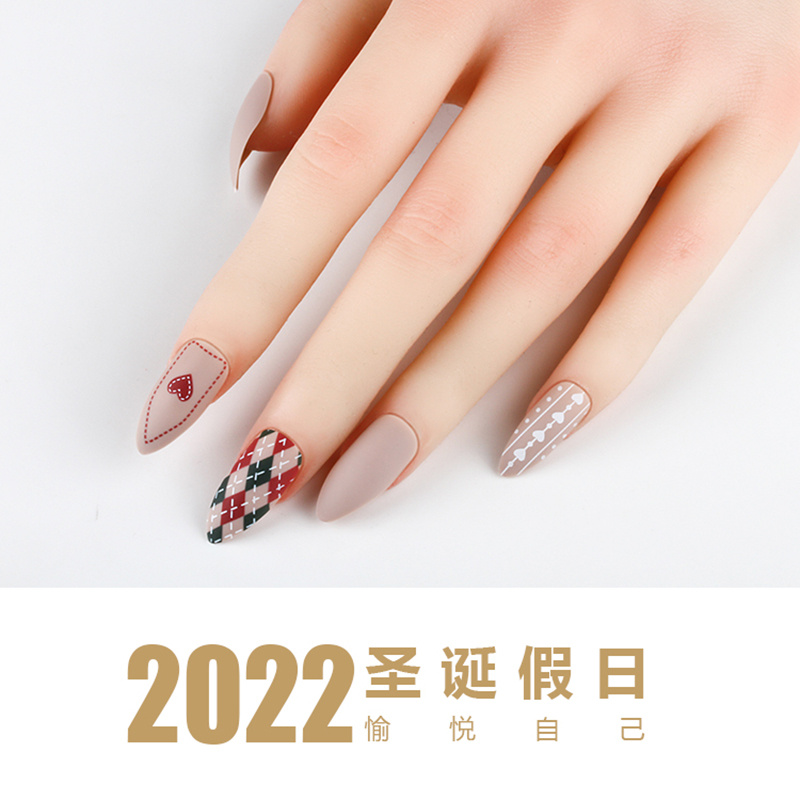 现货24片欧美尖头穿戴甲毛衣纹爱心图案假指甲丝带包装带工具包