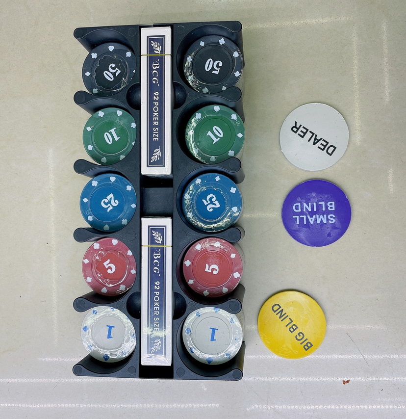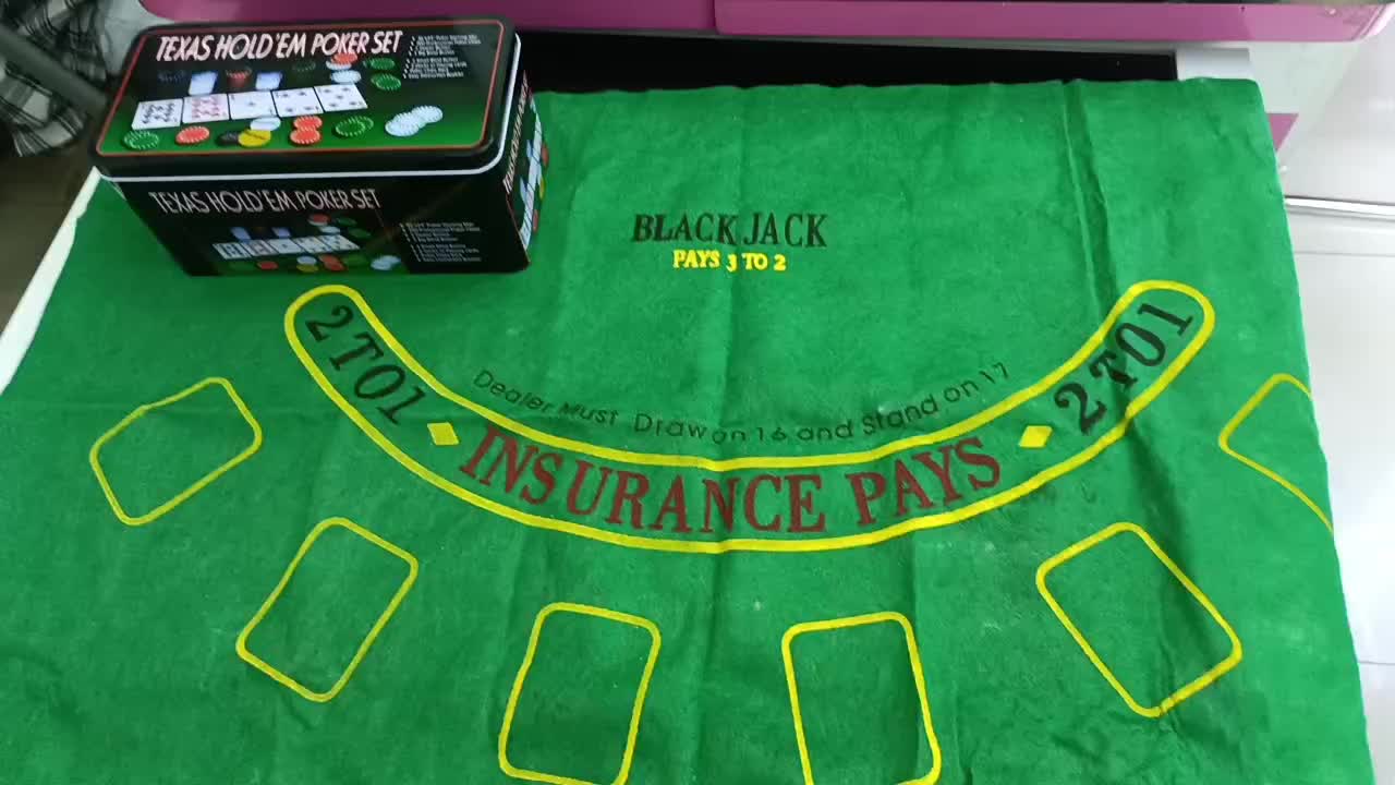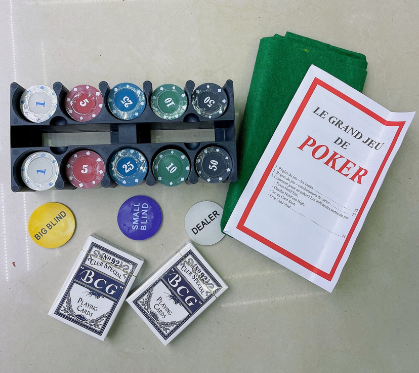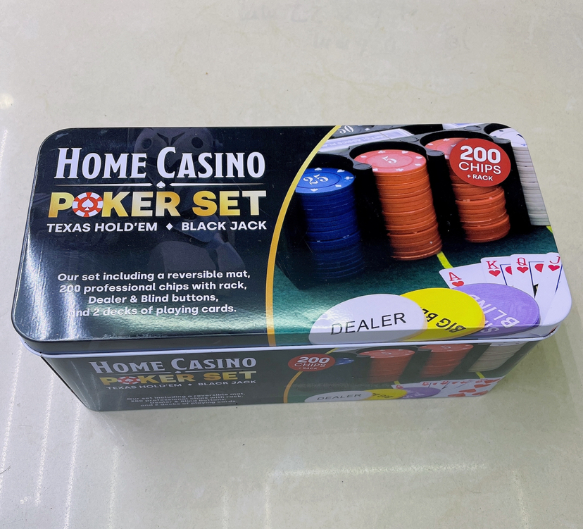 产品包装说明:筹码200片➕庄码3个➕桌布1张➕扑克2副➕说明书1份➕铁盒