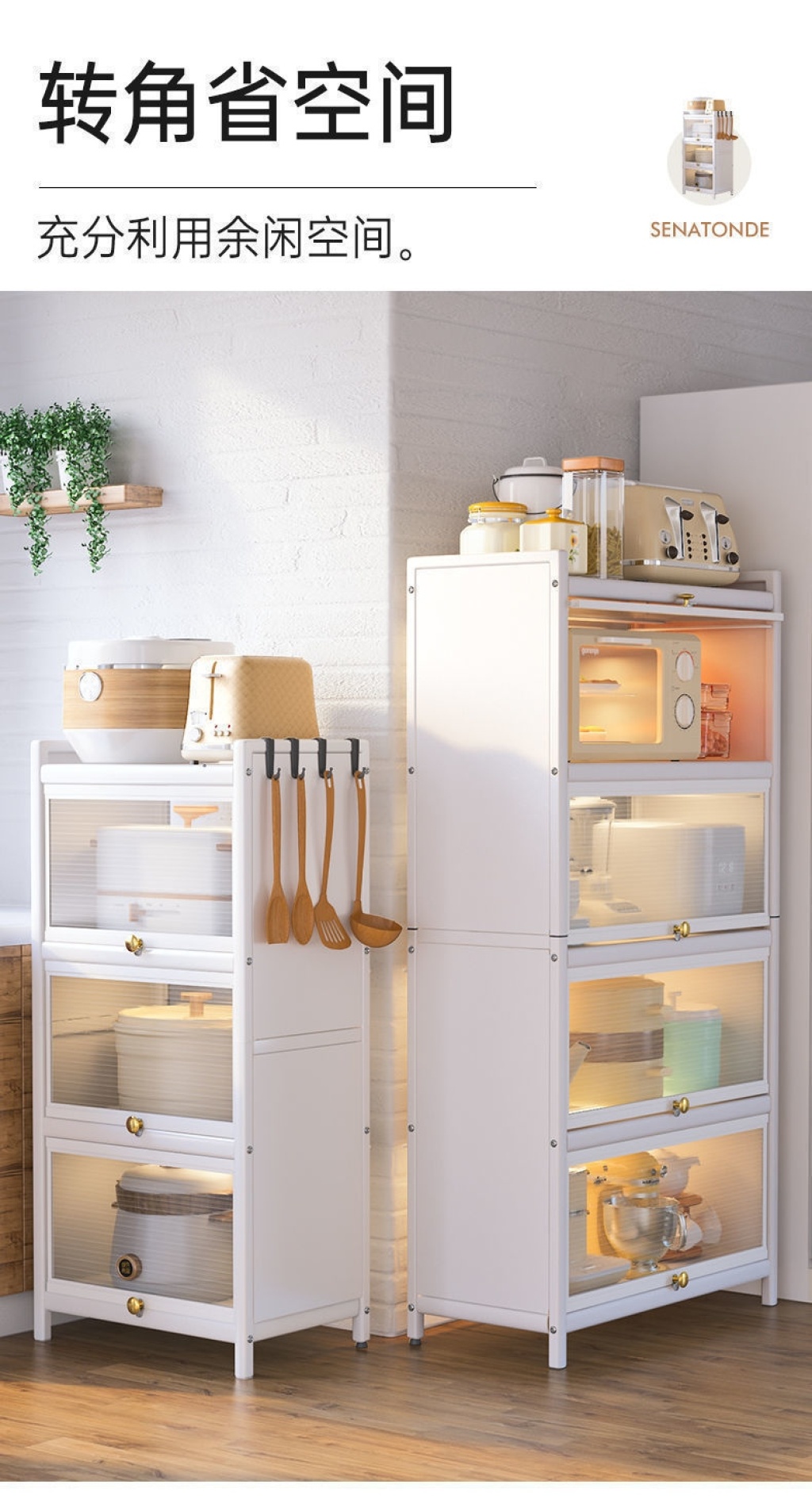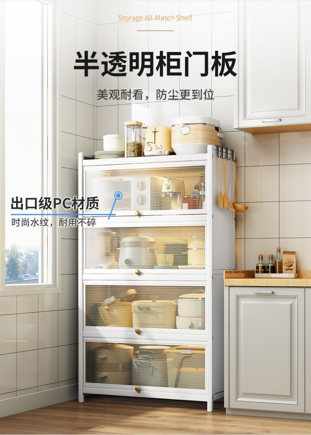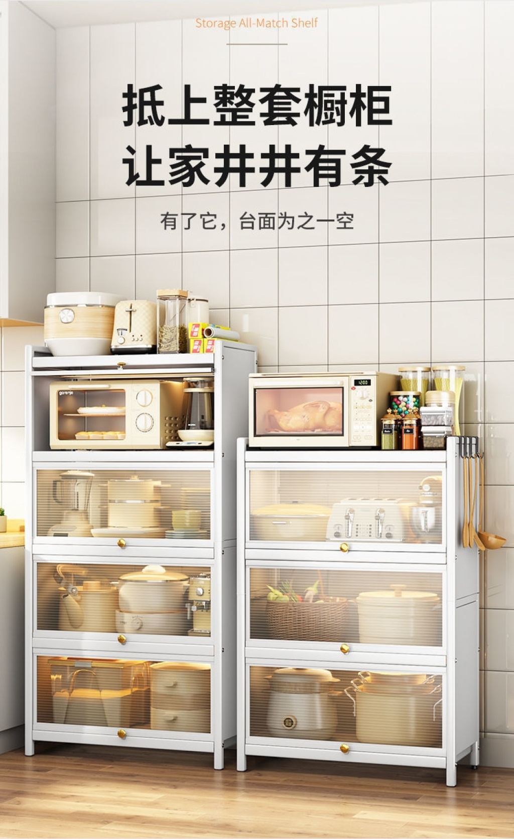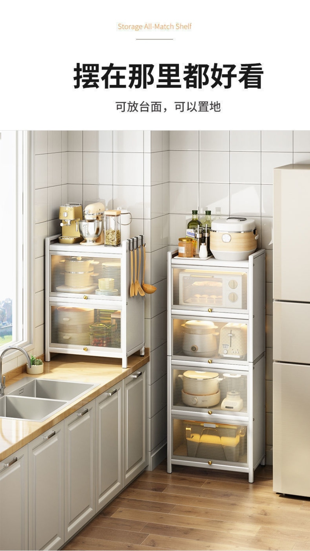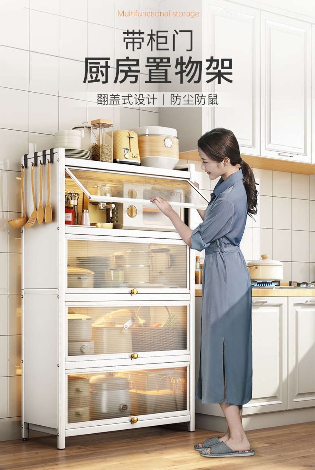 新款带门翻盖式厨房置物架落地式多层碗碟锅具储物柜微波炉收纳架