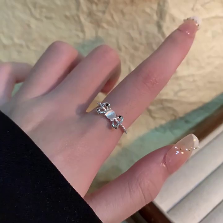 法式甜美简约猫眼石蝴蝶结开口珍珠戒指小众轻奢时尚高级感食指戒