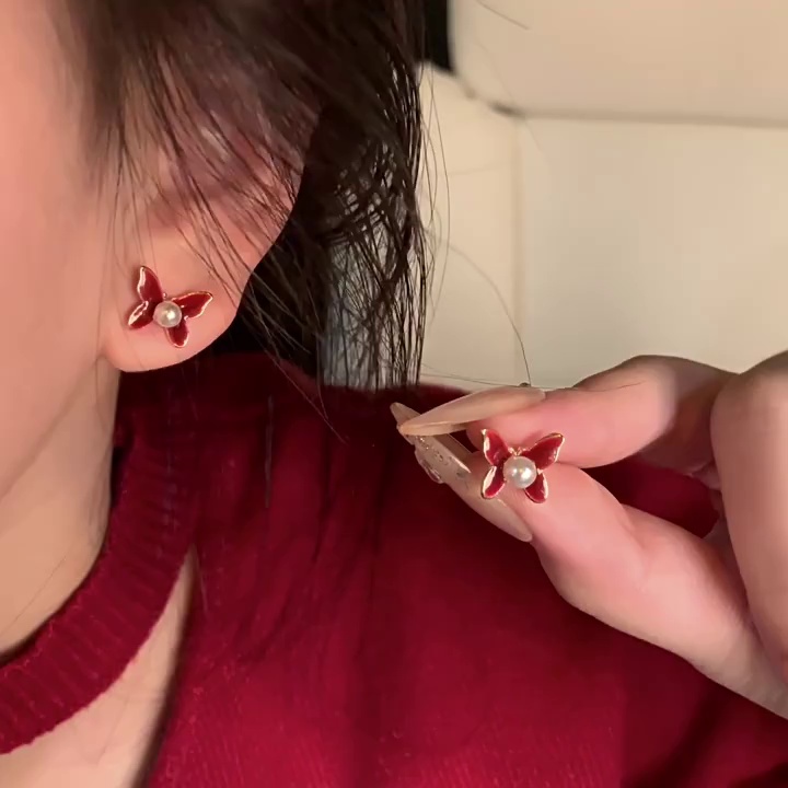 红棕色滴油蝴蝶结耳钉女复古轻奢珍珠耳环甜美气质小巧精致耳饰