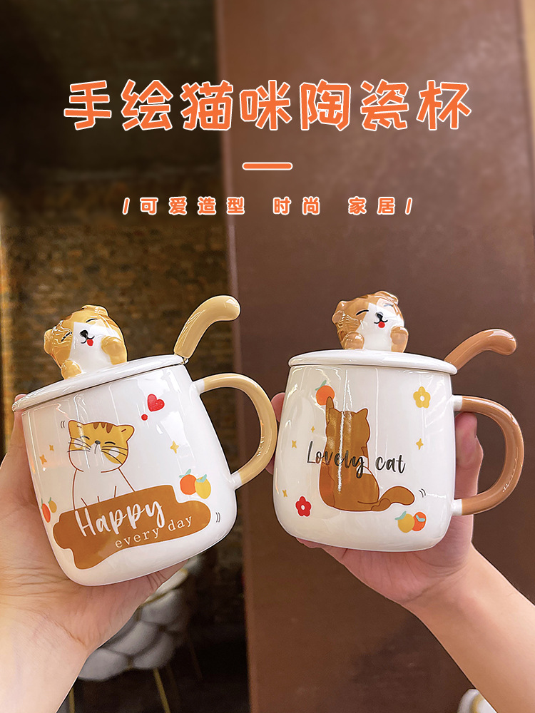ins卡通可爱马克杯带盖勺高颜值陶瓷喝水杯子男女生设计感咖啡杯