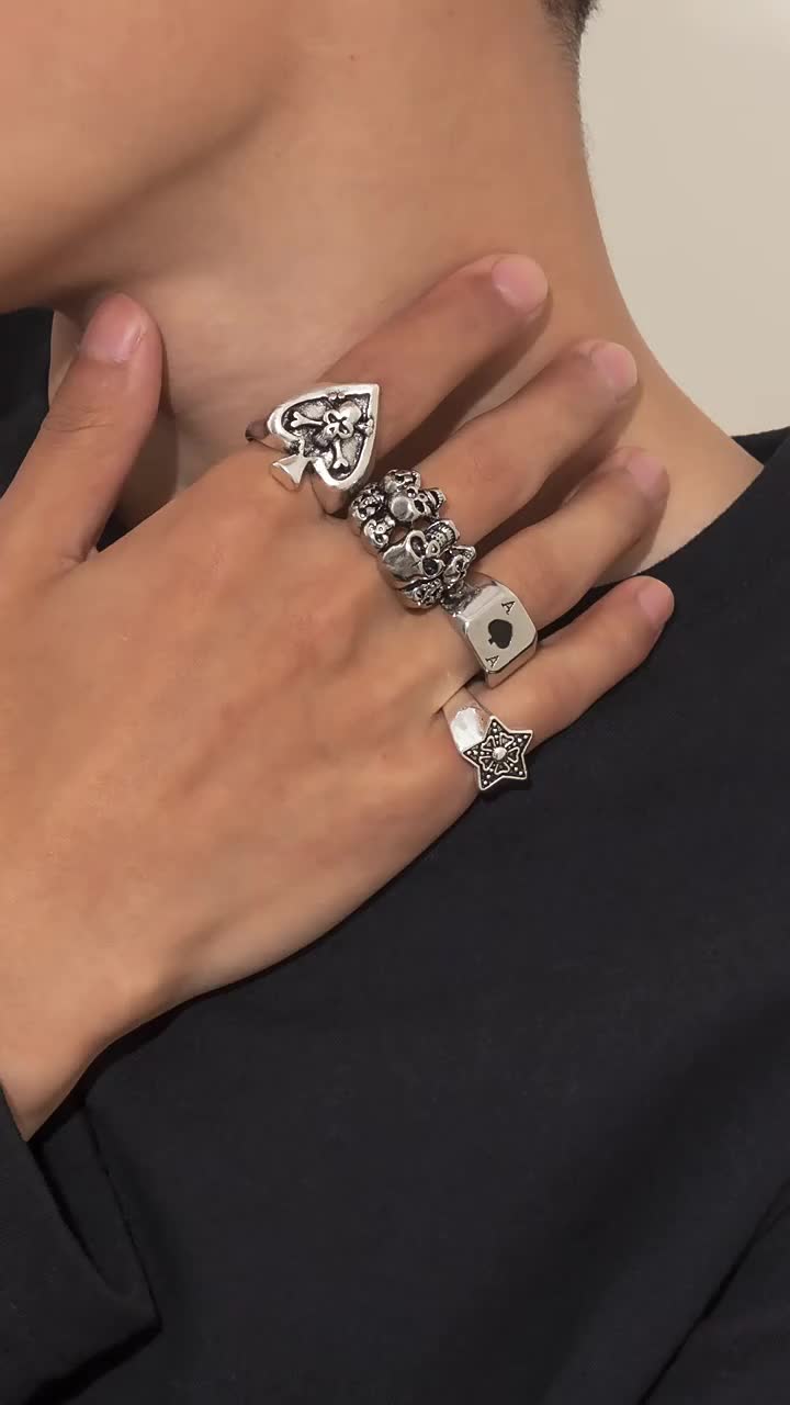 欧美跨境手饰品 个性复古骷颅头黑桃A五角星设计感男士戒指四件套 投诉