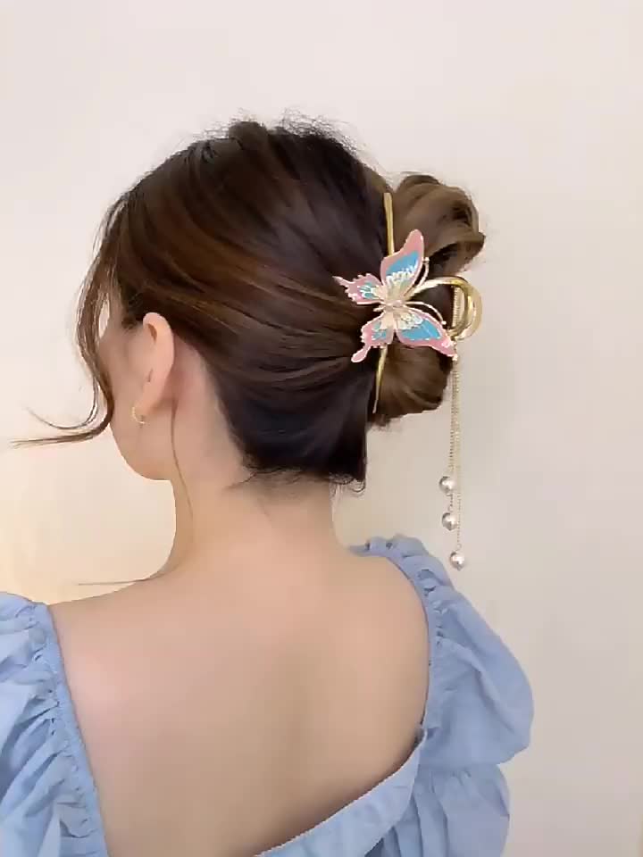 国风彩绘蝴蝶大号抓夹高级感流苏发夹秋季气质优雅后脑勺鲨鱼夹子