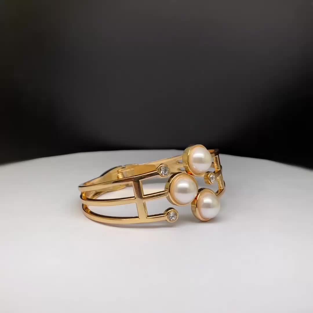 珍珠金色手镯镂空女性个性小众夸张风原创设计欧美外贸出口首饰品 投诉