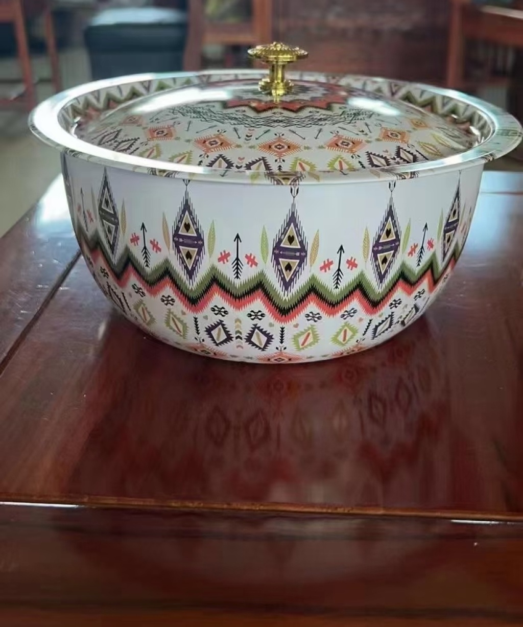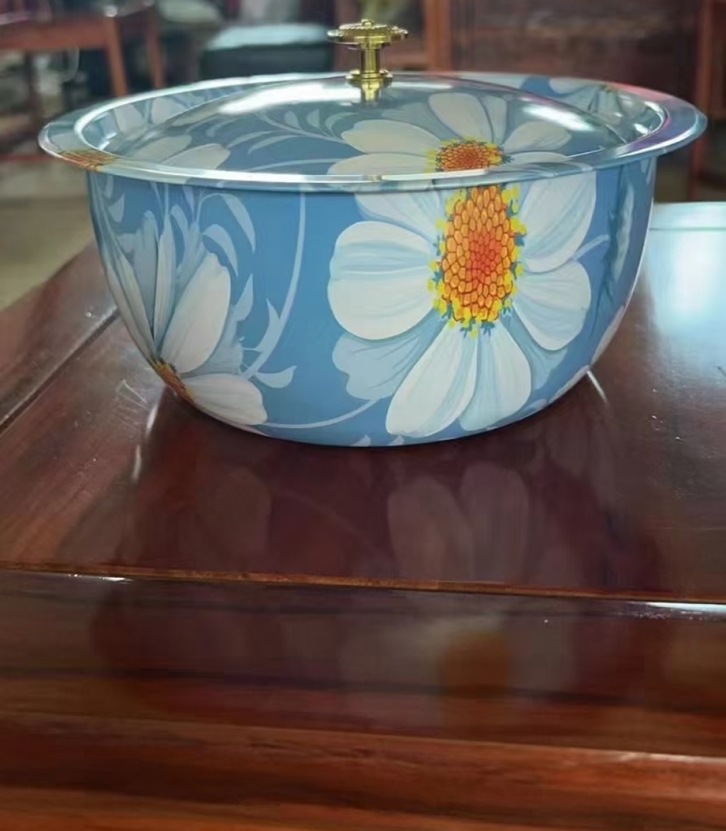 西式不锈钢带盖彩花果盆工艺盆水果盆蔬菜盆汤盆置物盆印花盆