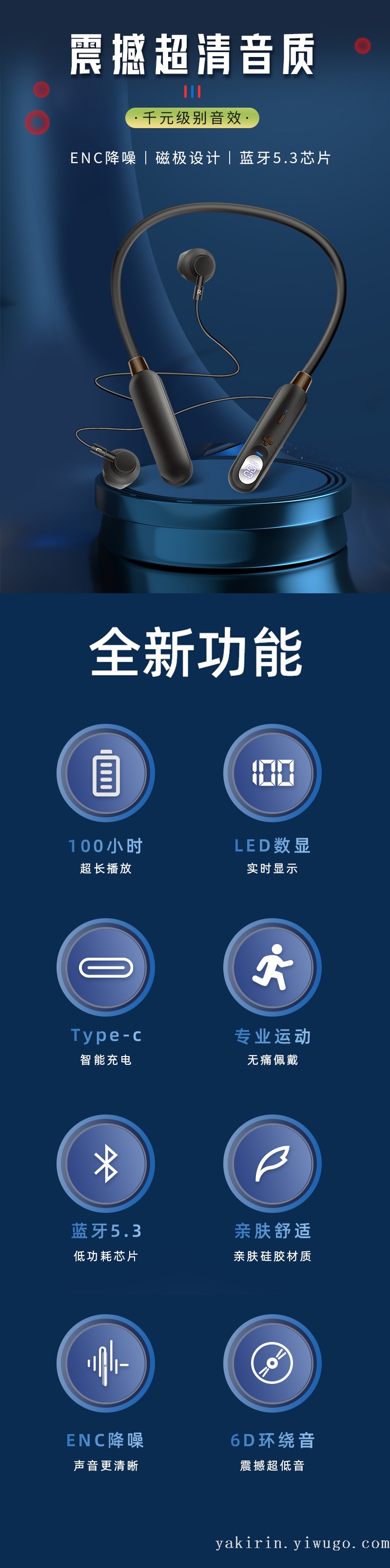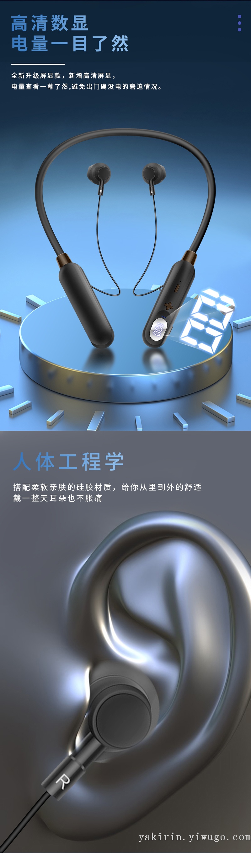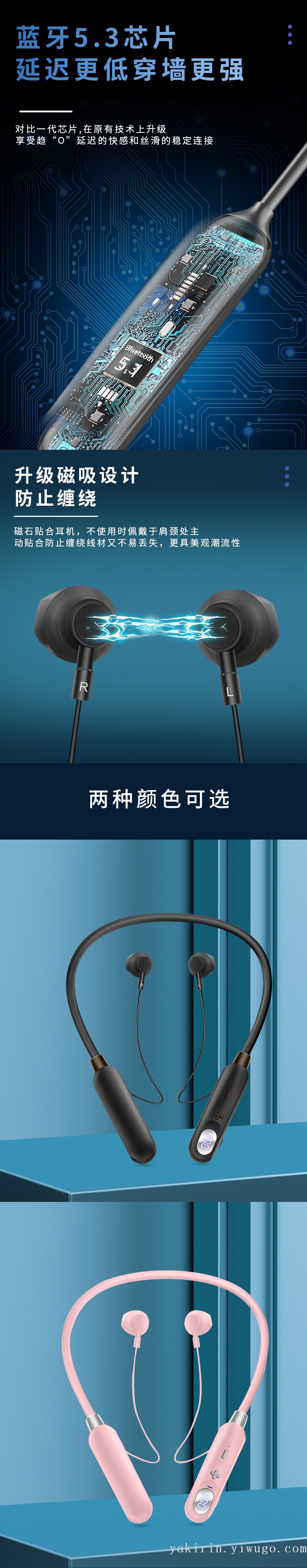 2022新款创意立体防水防汗数显降噪磁吸设计运动挂脖无线蓝牙耳机