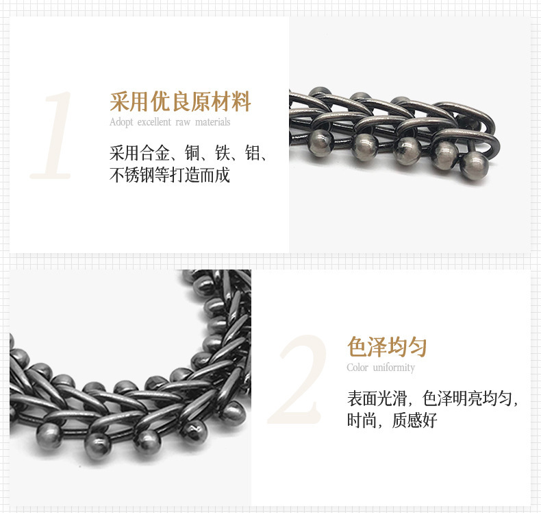 • 我司主要生产产品有两大类。专业生产五金链条,手袋链,蛇链,饰品链,万字链,珠链,NK链,灯饰链等。专业生产设计制造锌合金压铸,奖牌,三档扣,弹簧圈,钩扣,锁头,装饰配件,吊钟,皮具合金,五金配件等