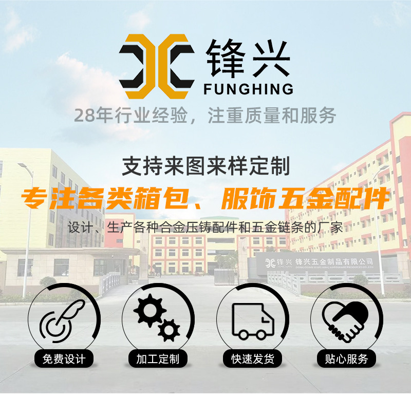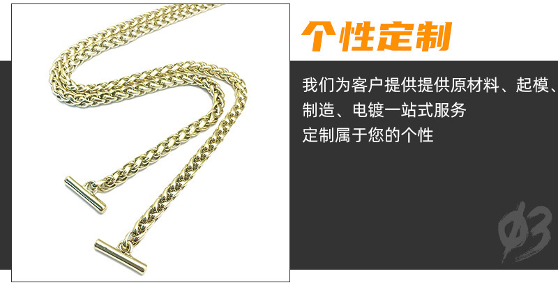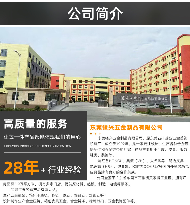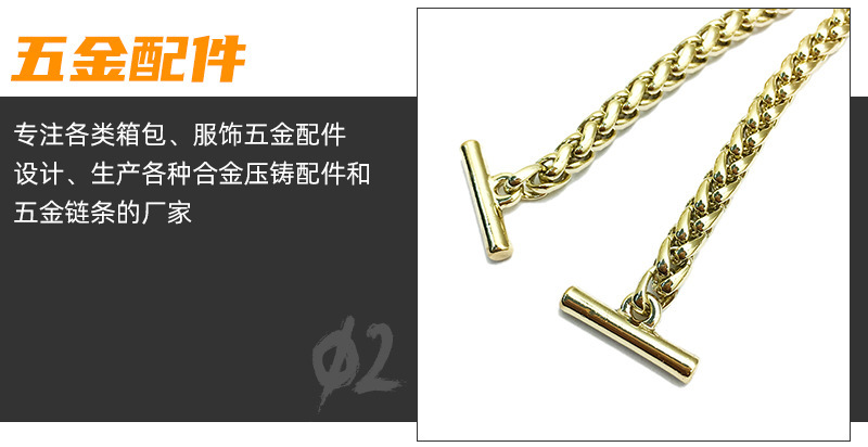 • 我司主要生产产品有两大类。专业生产五金链条,手袋链,蛇链,饰品链,万字链,珠链,NK链,灯饰链等。专业生产设计制造锌合金压铸,奖牌,三档扣,弹簧圈,钩扣,锁头,装饰配件,吊钟,皮具合金,五金配件等