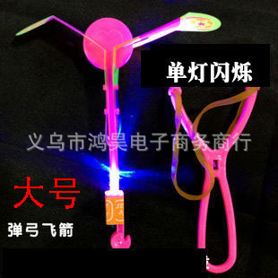 将飞箭的两片叶子折成螺旋状,左手捏住飞箭圆柄,右手拉紧弹弓,左手松开,飞箭即可飞出20米高左右。最大的特点是可以旋转,缓缓落下,配合自带的led灯光,晚上看起来很绚丽,象七彩蘑菇一样徐徐飘下。是一款不错的夜间玩具,建议售价:5元