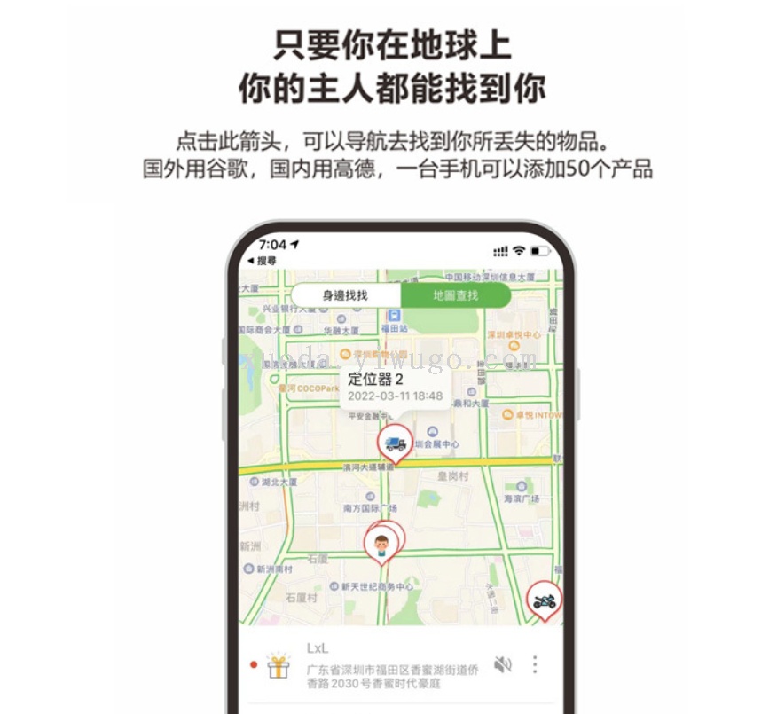 3.全球定位功能:定位器每两秒会发出安全的蓝牙信号,让周边的苹果设备能接侦测及接收此信号并上传共享到苹果ICOUD服务器,主人可以通过APP软件了解到Findmytag的位置, 可导航去寻找物品,让你寻物无忧