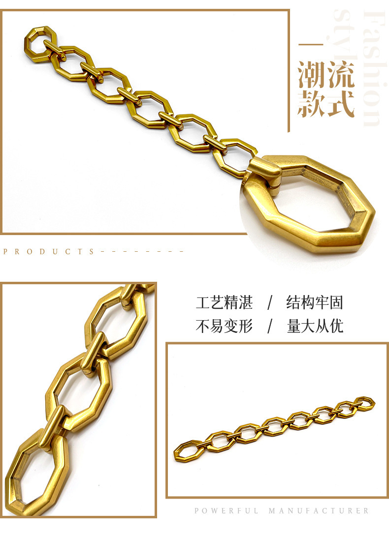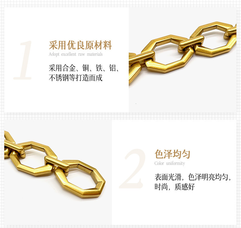 • 我司主要生产产品有两大类。专业生产五金链条,手袋链,蛇链,饰品链,万字链,珠链,NK链,灯饰链等。专业生产设计制造锌合金压铸,奖牌,三档扣,弹簧圈,钩扣,锁头,装饰配件,吊钟,皮具合金,五金配件等