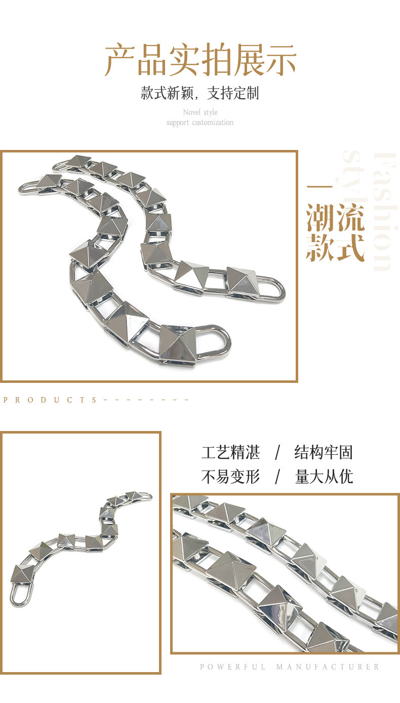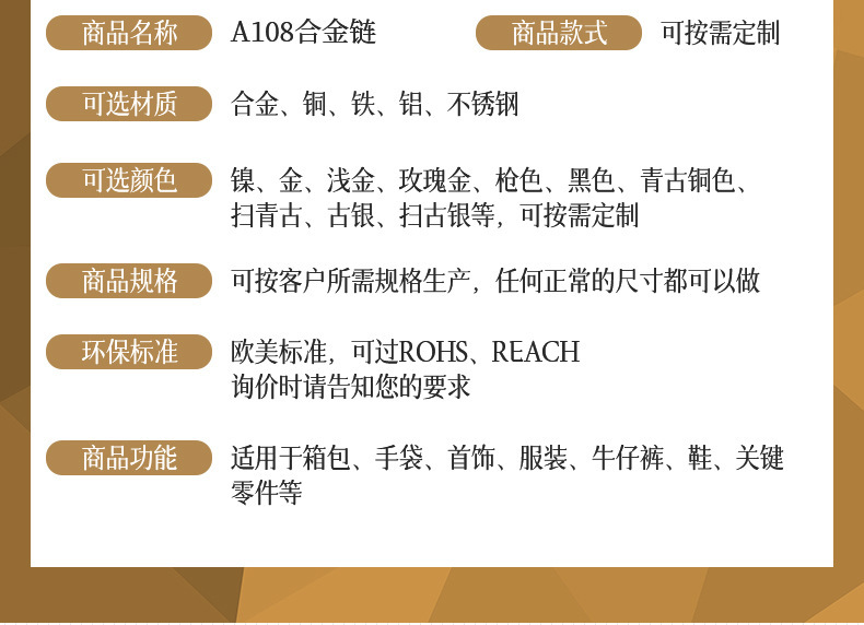 • 我司主要生产产品有两大类。专业生产五金链条,手袋链,蛇链,饰品链,万字链,珠链,NK链,灯饰链等。专业生产设计制造锌合金压铸,奖牌,三档扣,弹簧圈,钩扣,锁头,装饰配件,吊钟,皮具合金,五金配件等