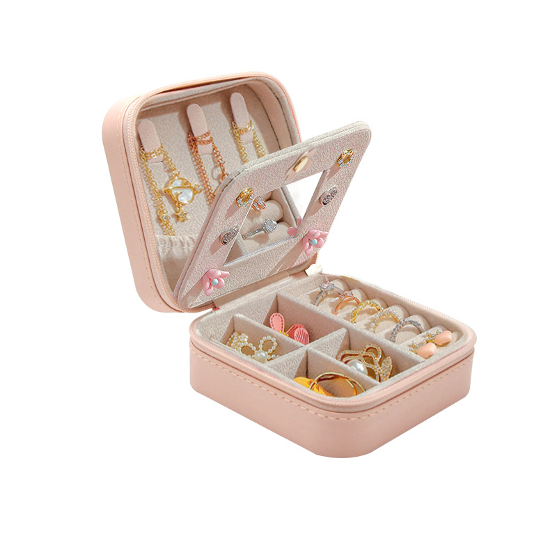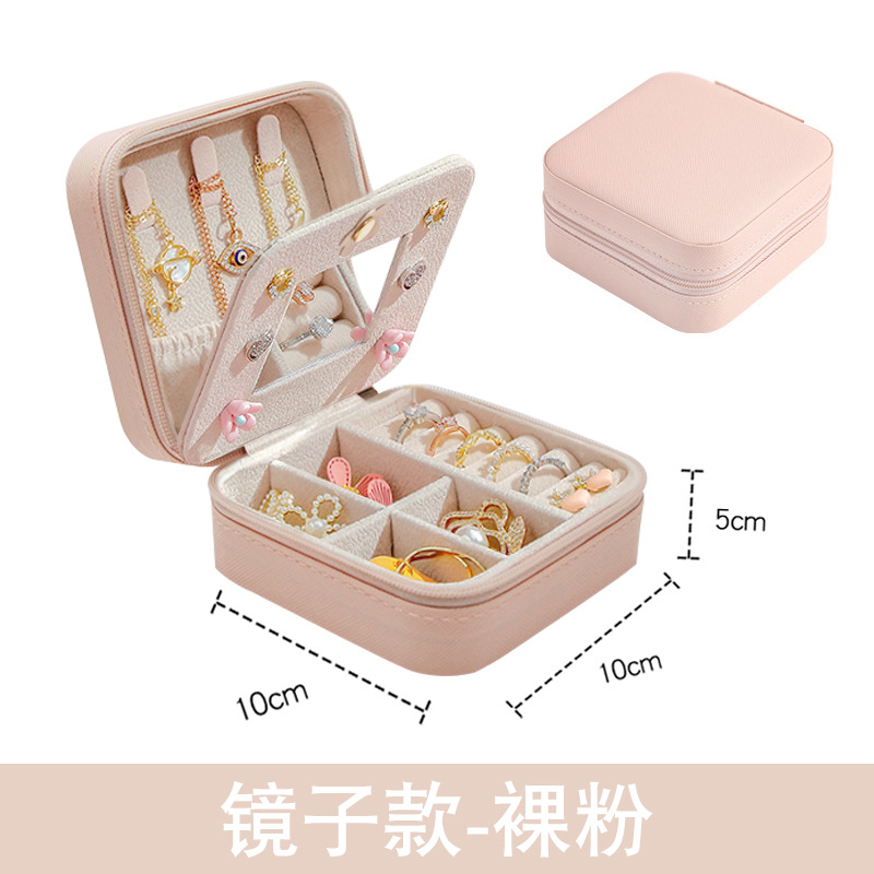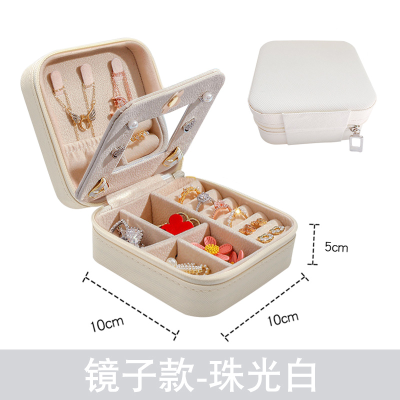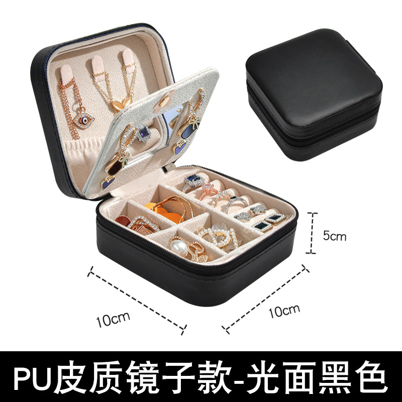 珠宝盒简约镜子款PU饰品盒旅行便携式耳钉项链收纳盒子现货批发