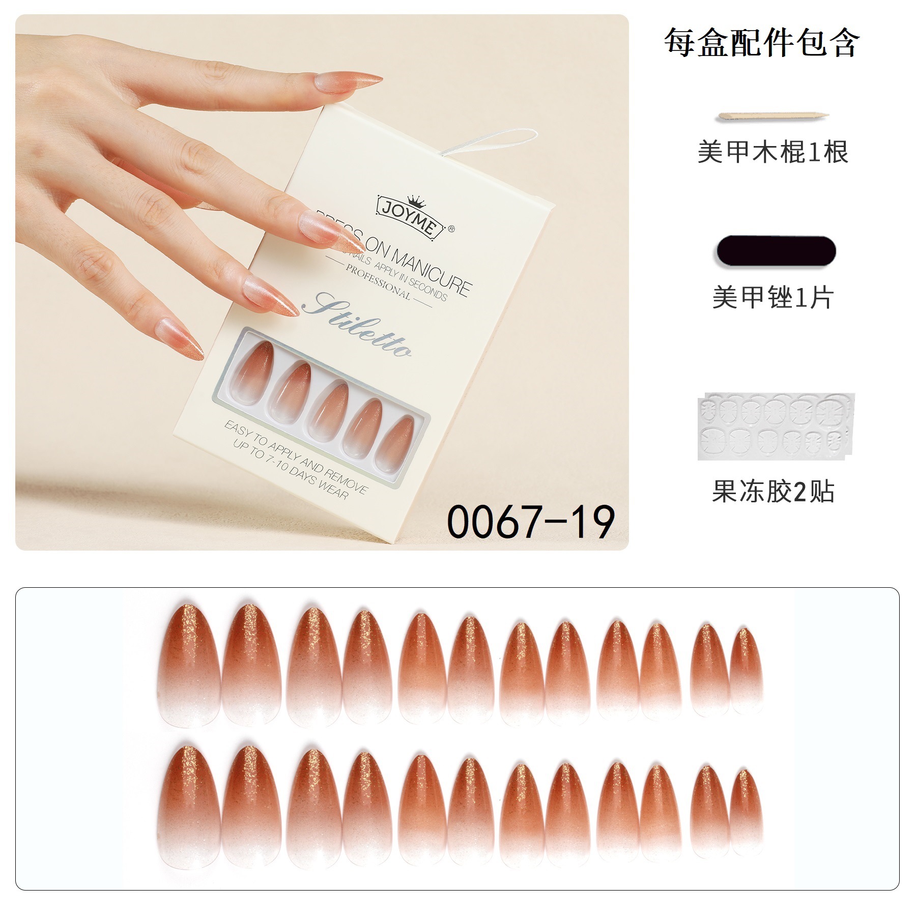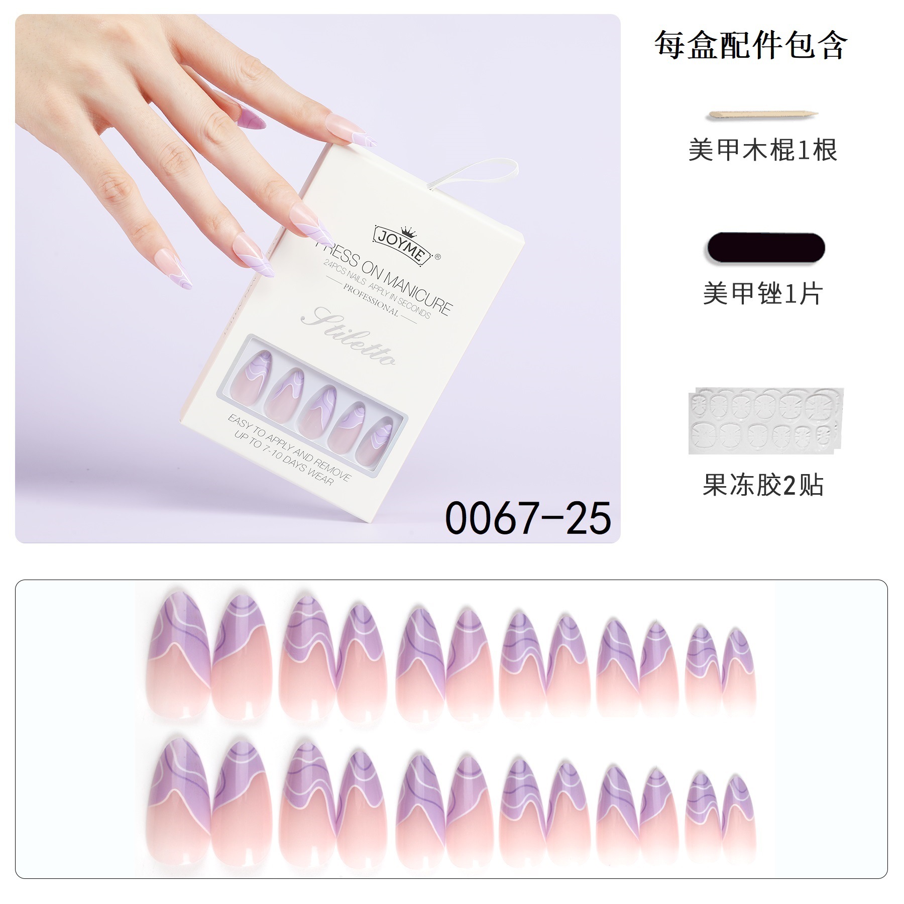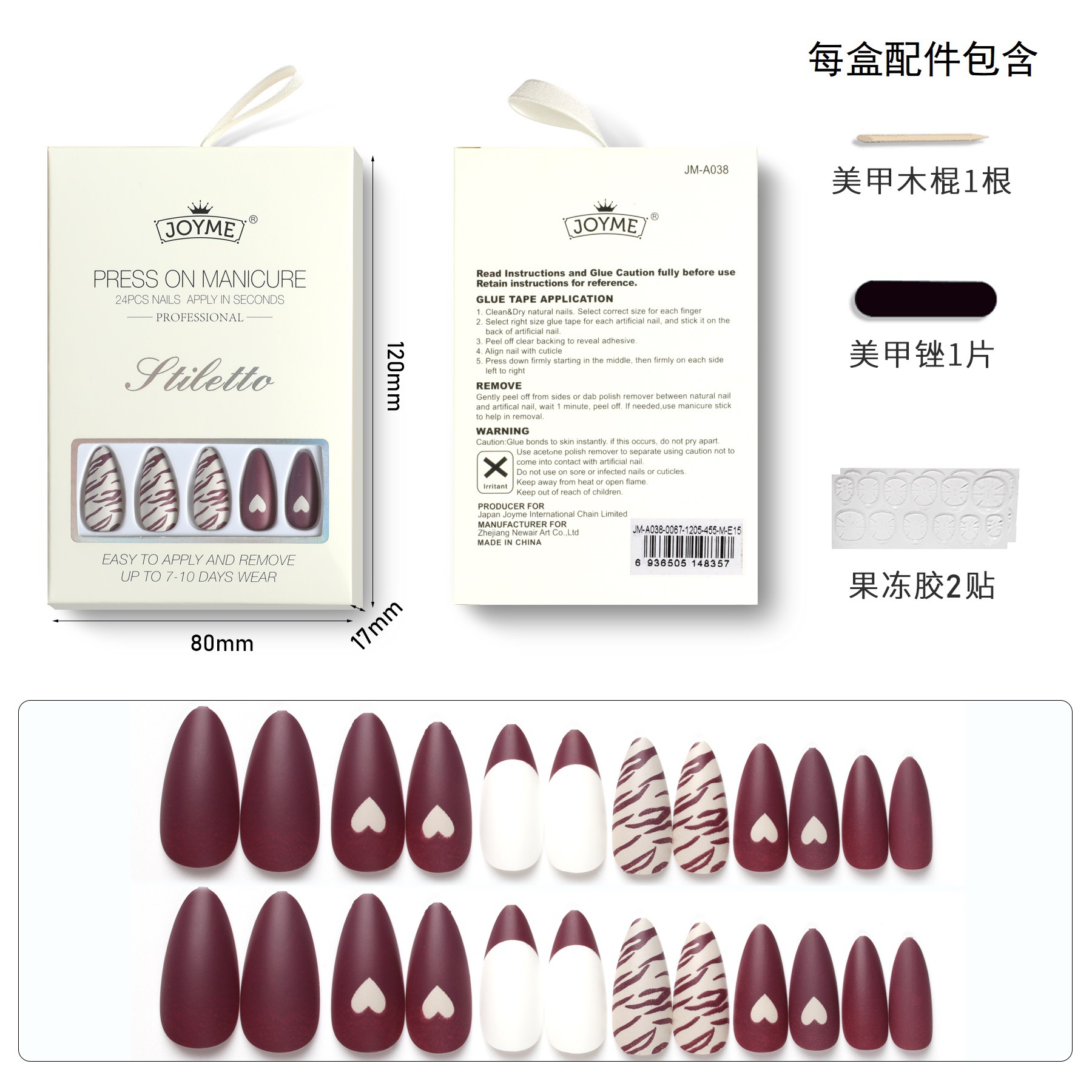 【包装方式】24片指甲+1个挫条+24粒果冻胶一盒 【包装尺寸】12*8*1.7CM(每盒)25g