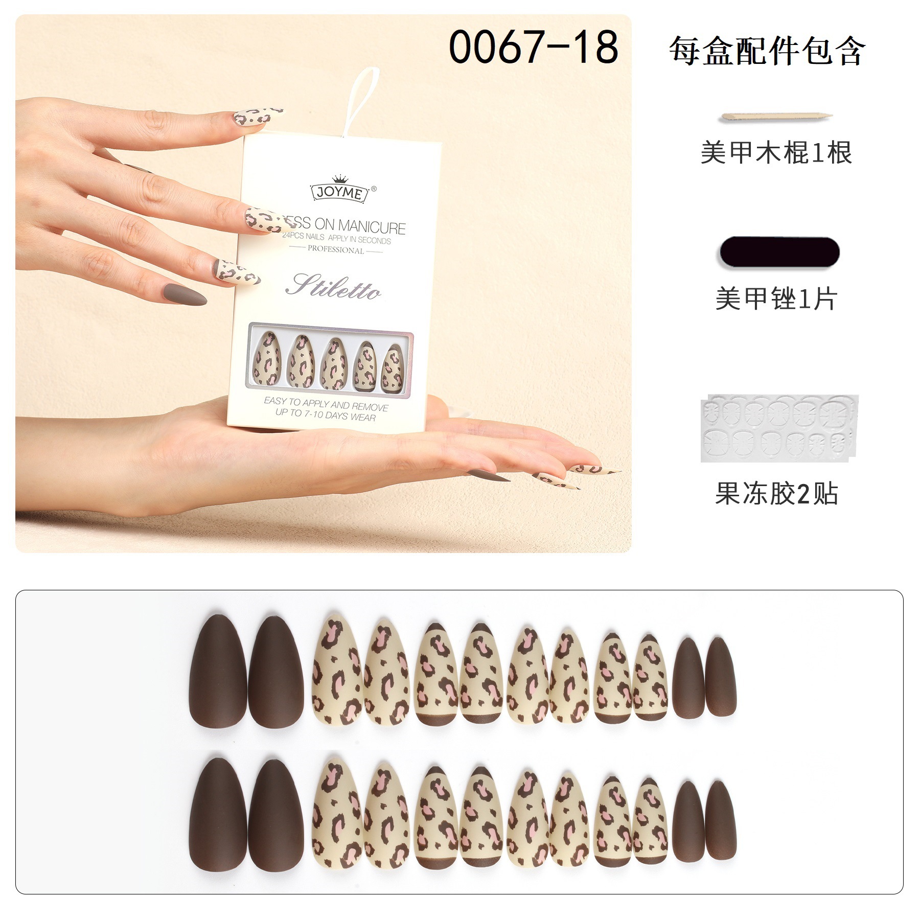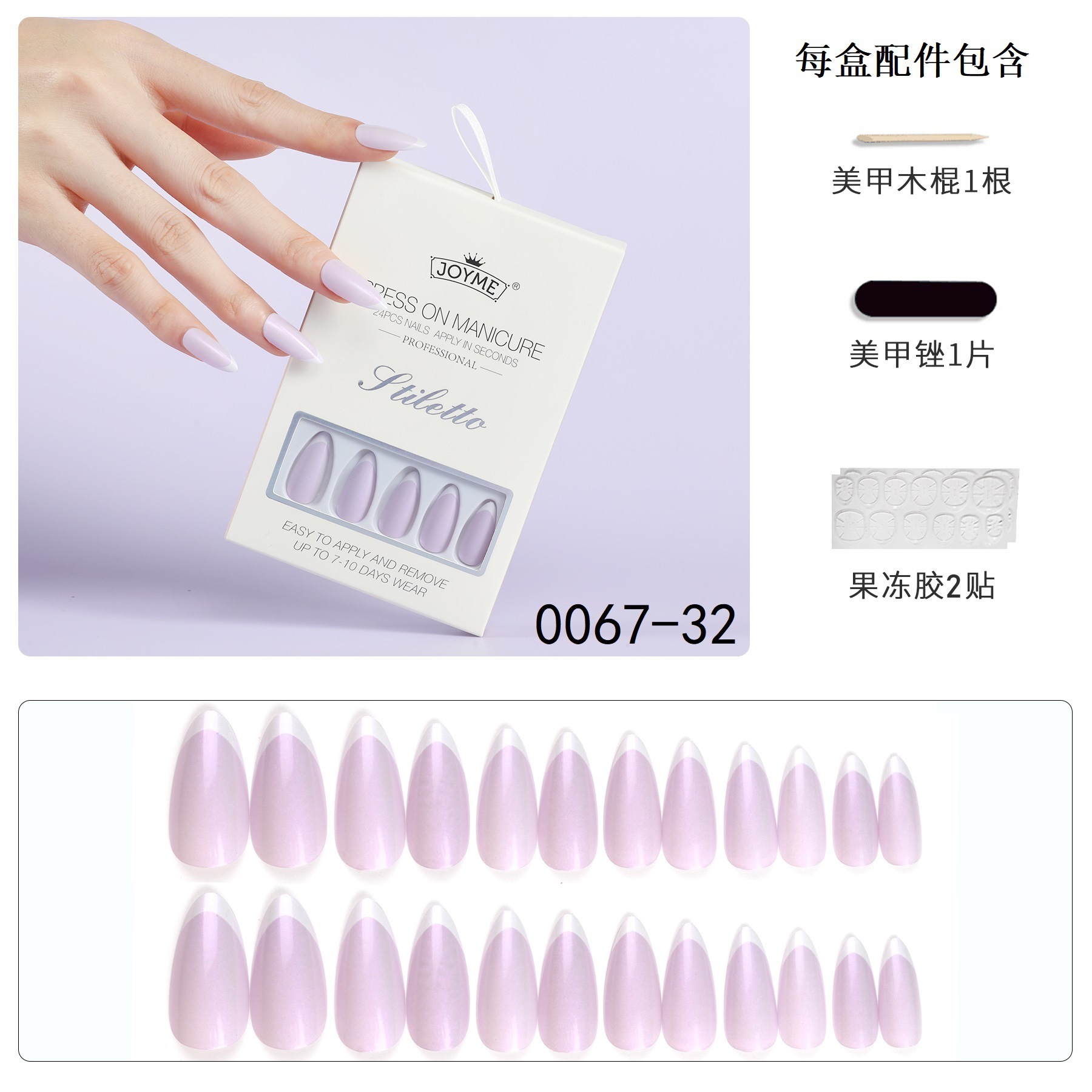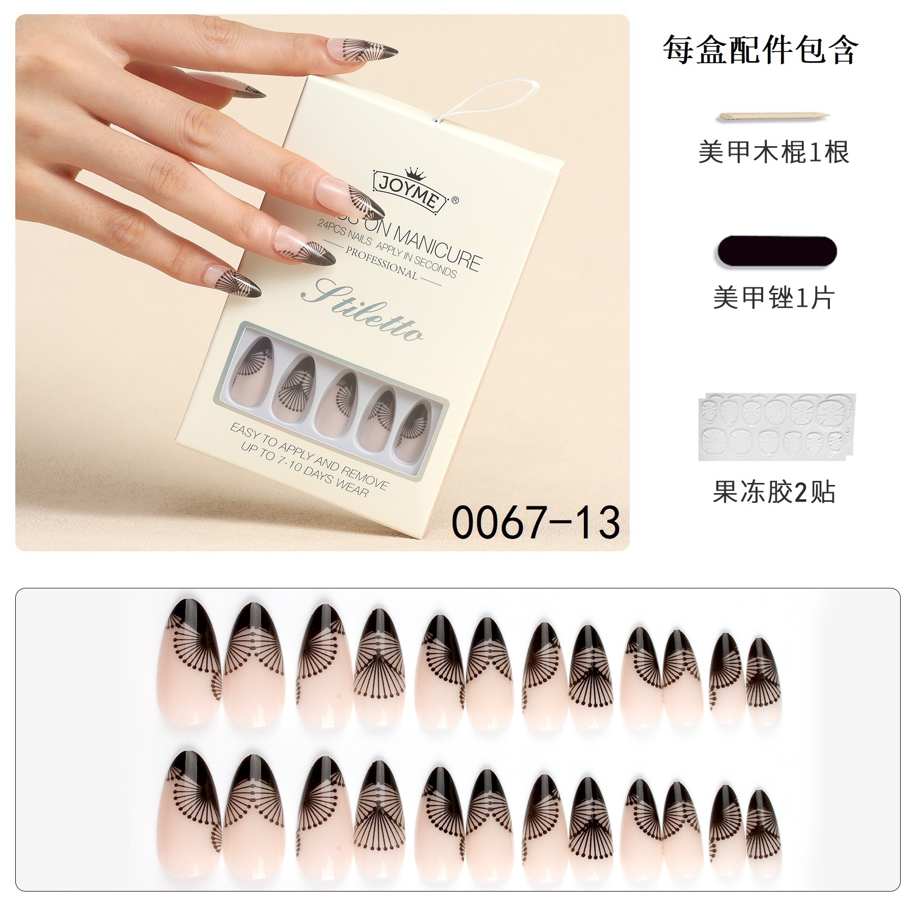 【包装方式】24片指甲+1个挫条+24粒果冻胶一盒 【包装尺寸】12*8*1.7CM(每盒)25g
