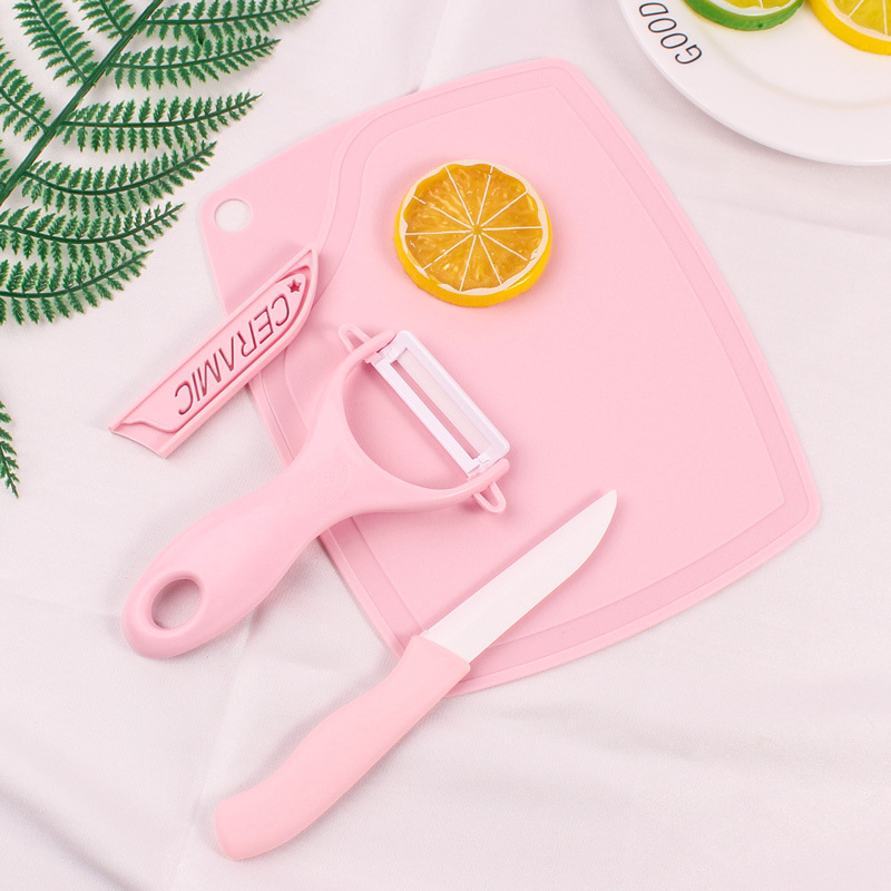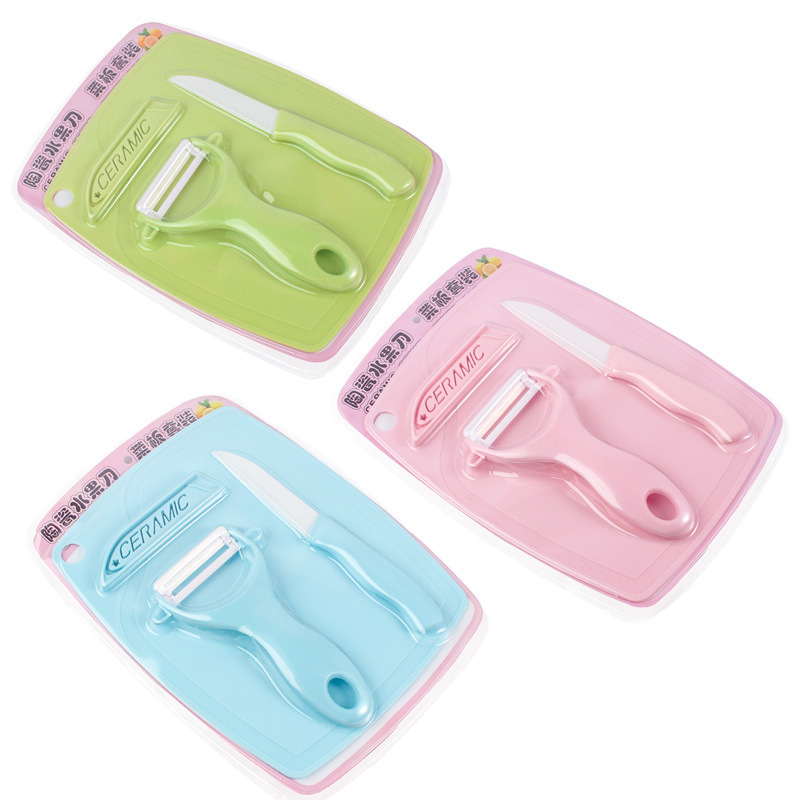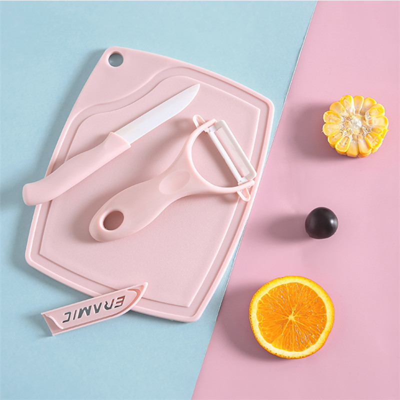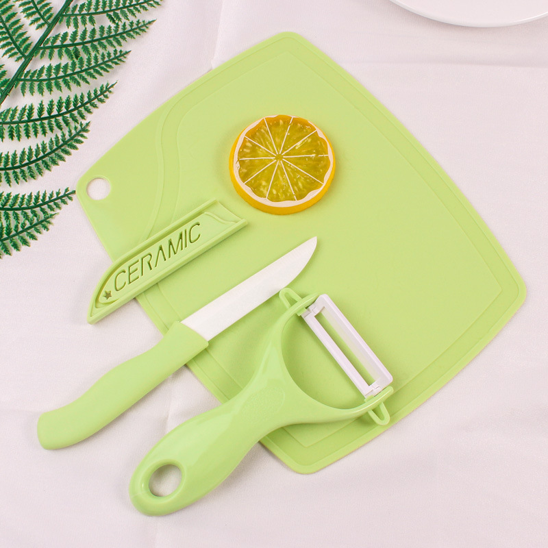 厨房陶瓷餐具三件套 陶瓷水果刀削皮器多功能创意瓜果刀带切菜板