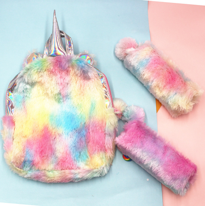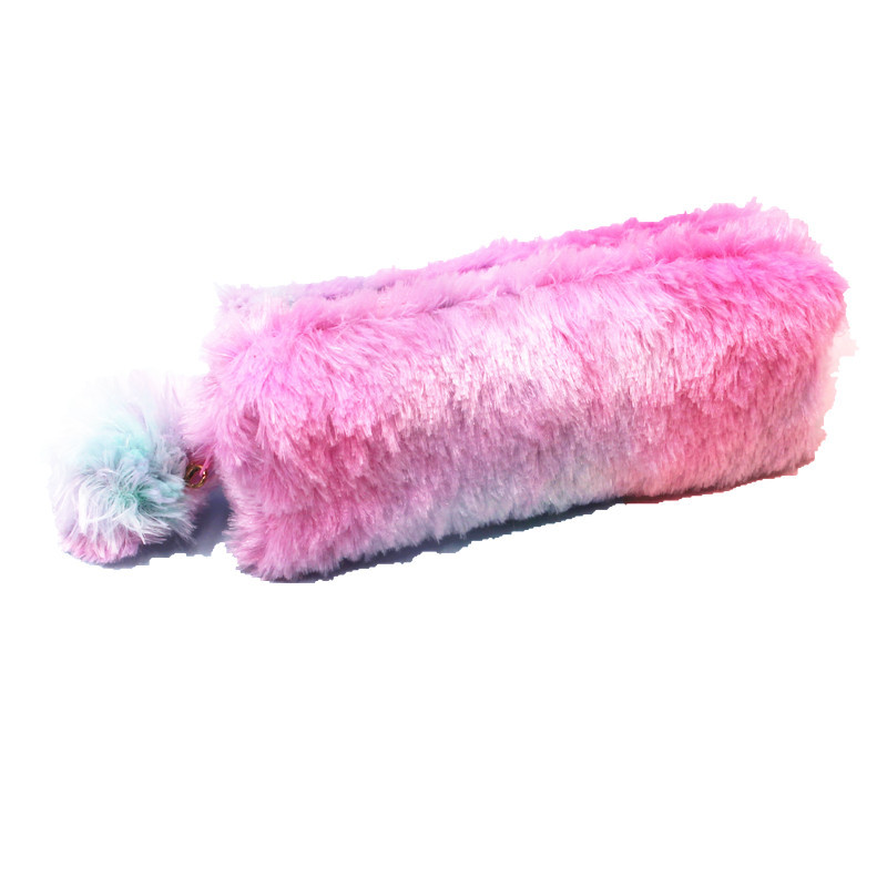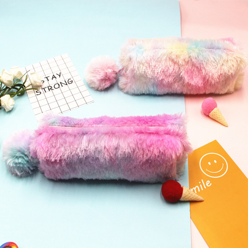 新款彩虹色毛绒笔袋学生大容量文具收纳袋八角笔袋少女心铅笔盒袋