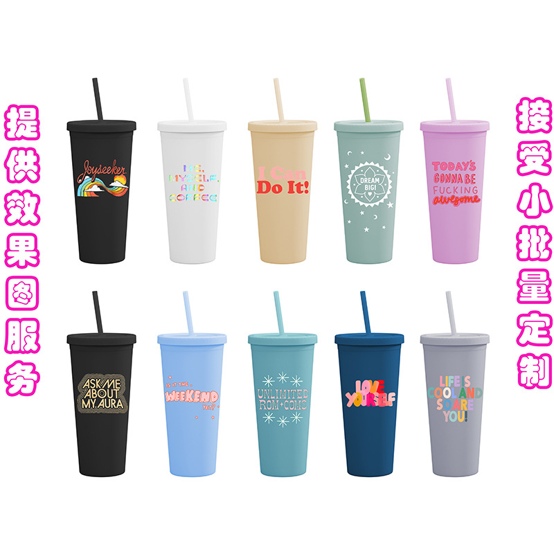 2024跨境热卖厂家直供双层塑料吸管杯22OZ大容量户外磨砂随手水杯