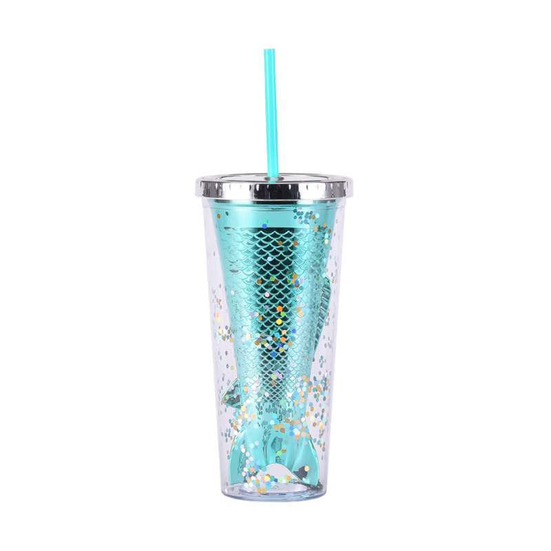 2024新款双层塑料杯创意渐变美人鱼尾吸管杯颜值电镀彩色亮片水杯