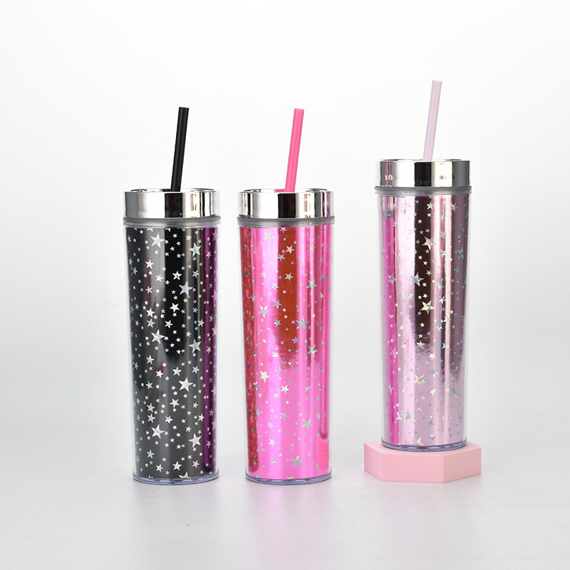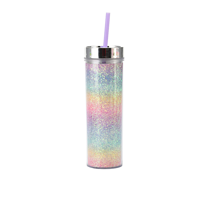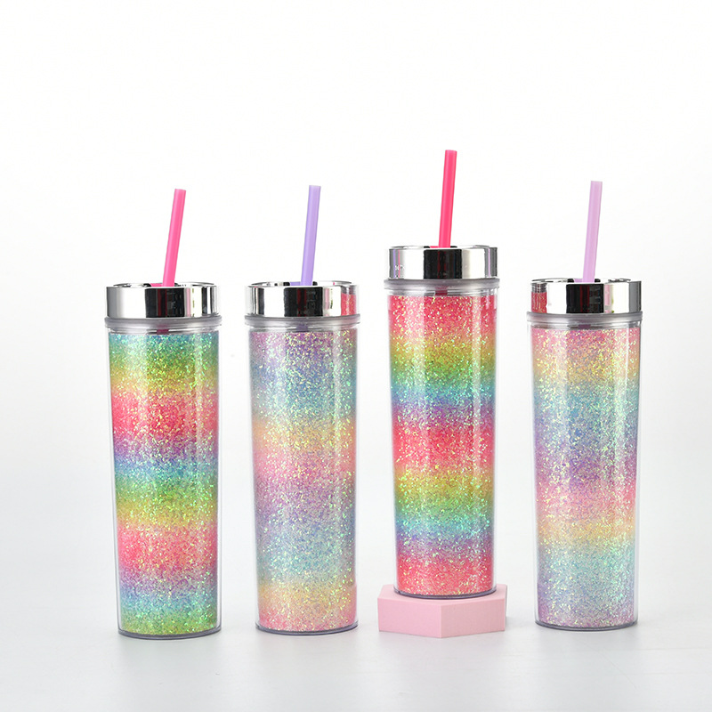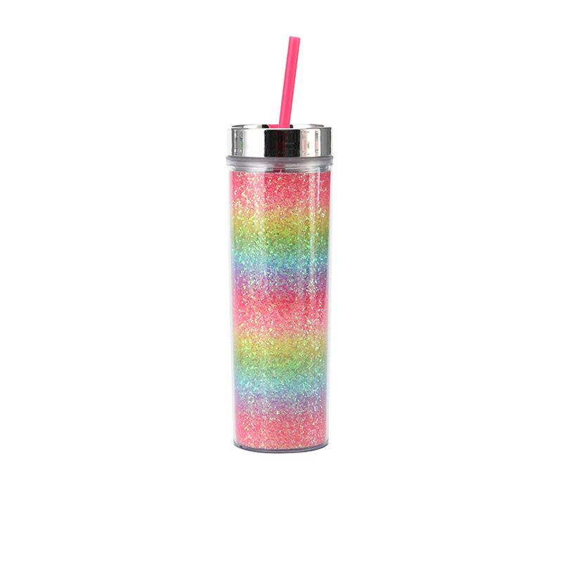 工厂直供16oz双层塑料吸管杯 可定彩虹渐变金葱直身杯通用冷饮杯
