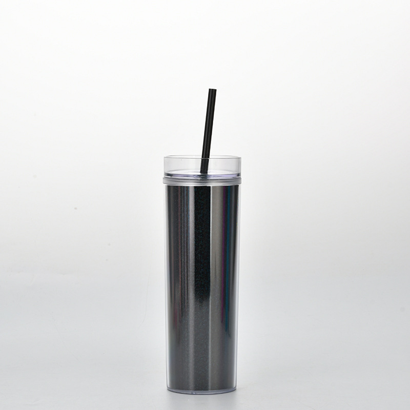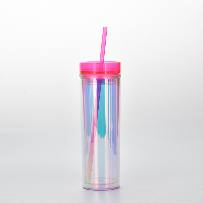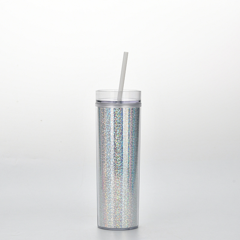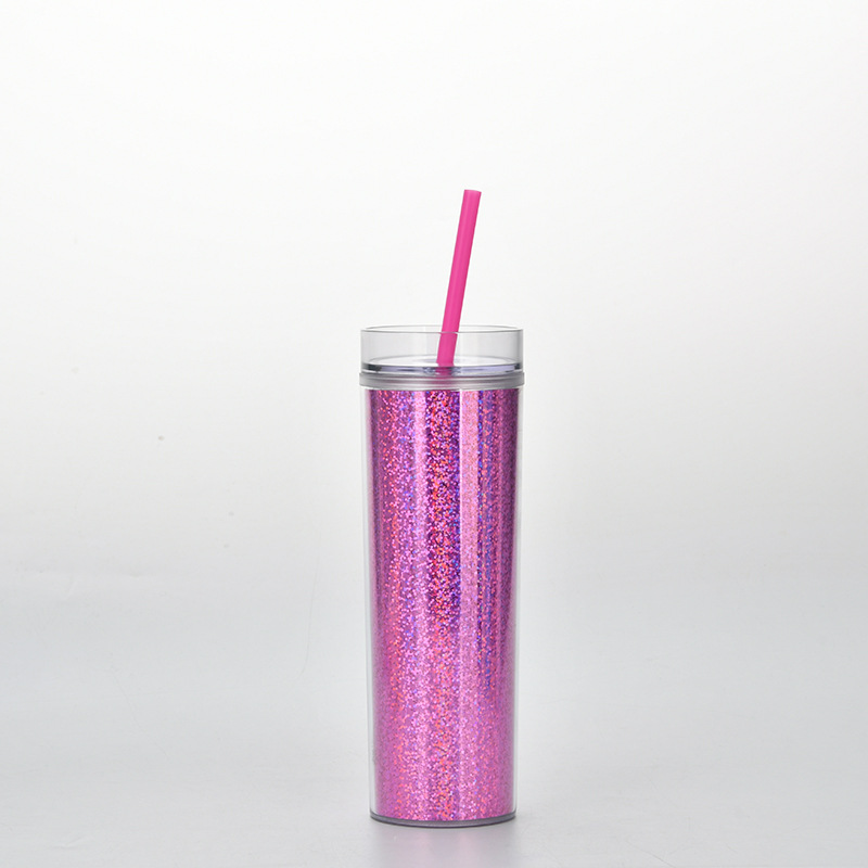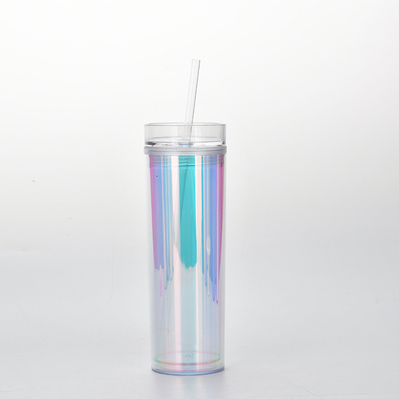 新款现货SKINNY直身双层塑料吸管杯 450ml可定水杯幻彩镭射饮料杯