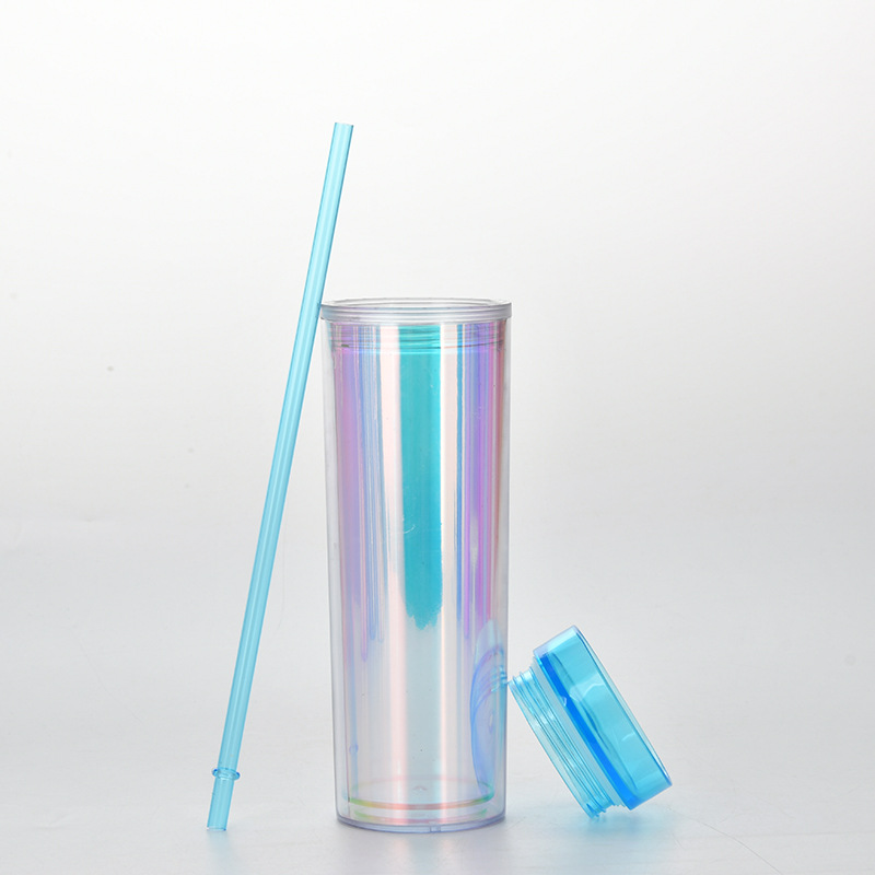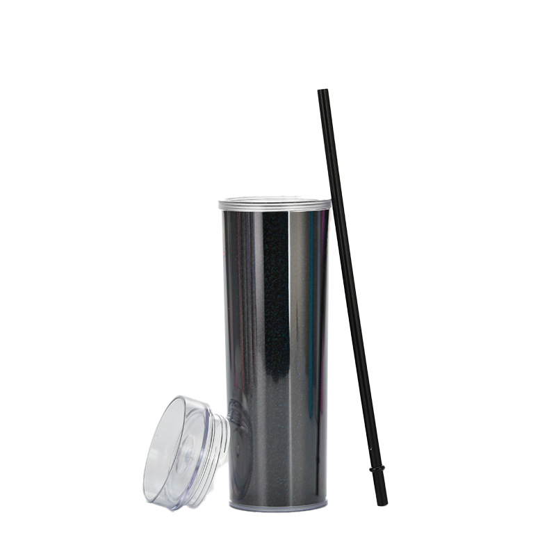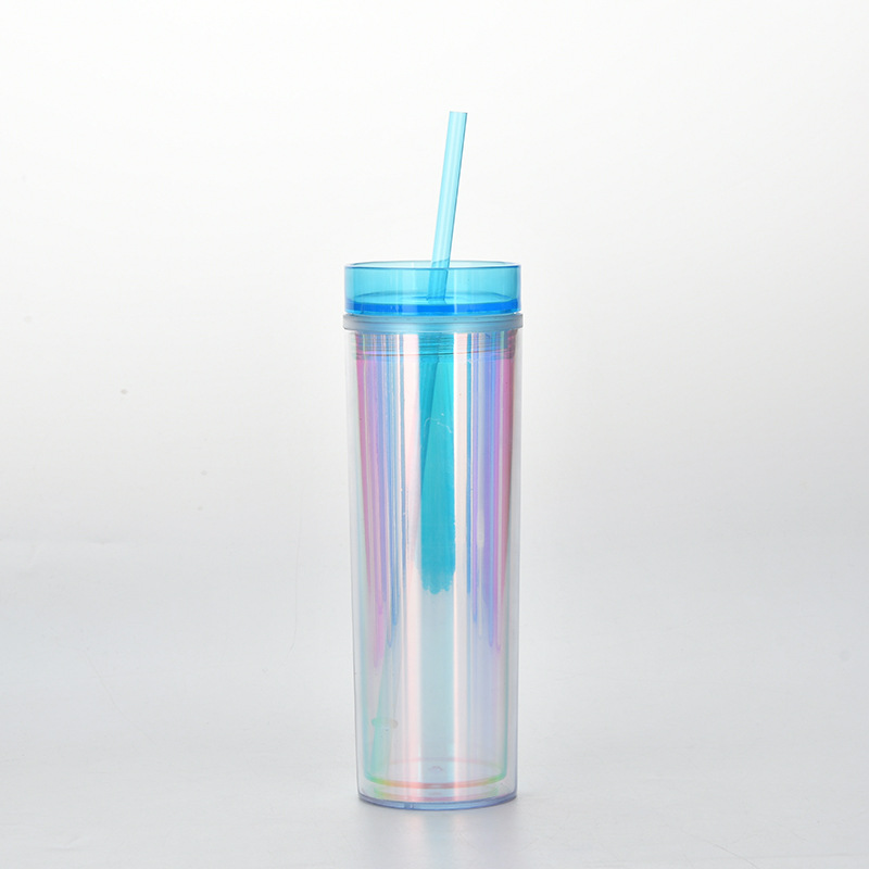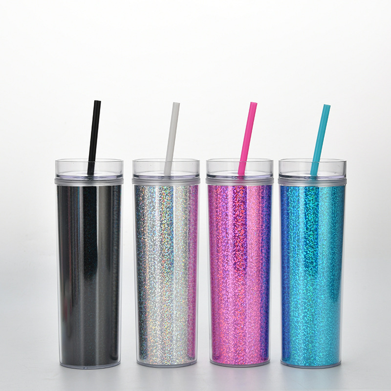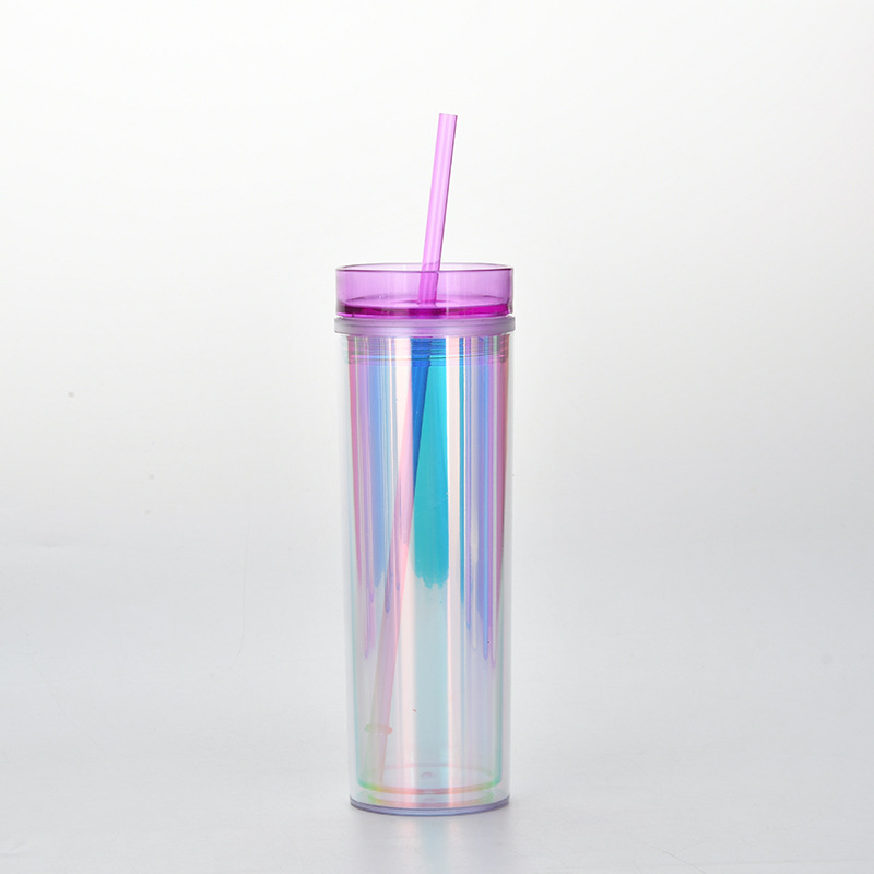 新款现货SKINNY直身双层塑料吸管杯 450ml可定水杯幻彩镭射饮料杯