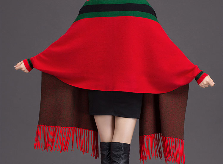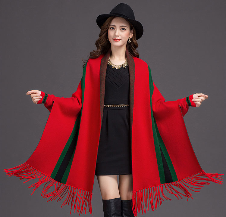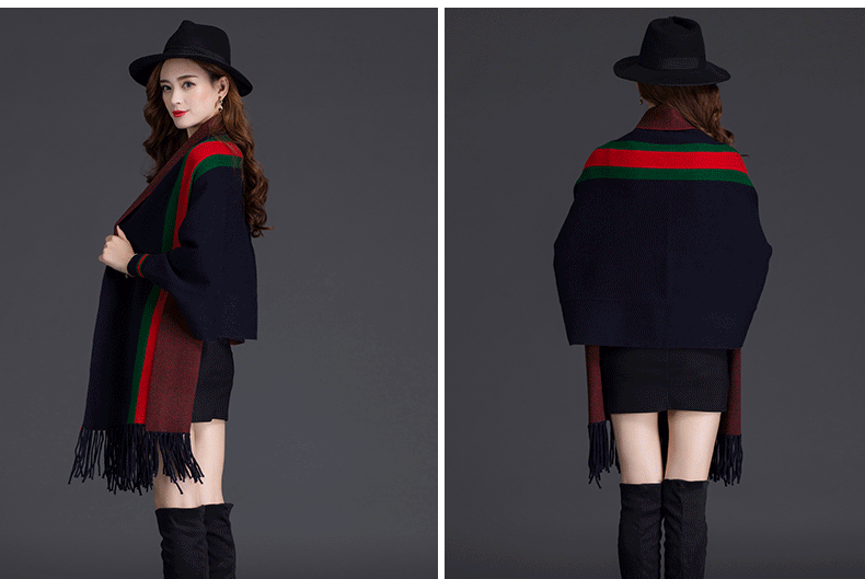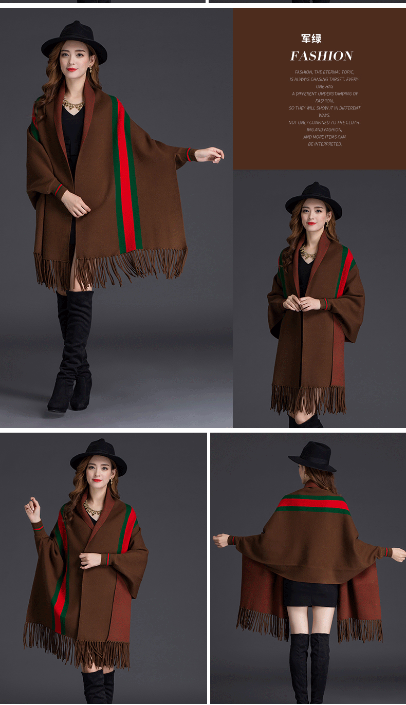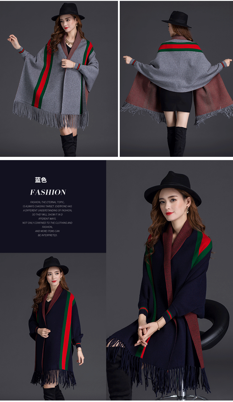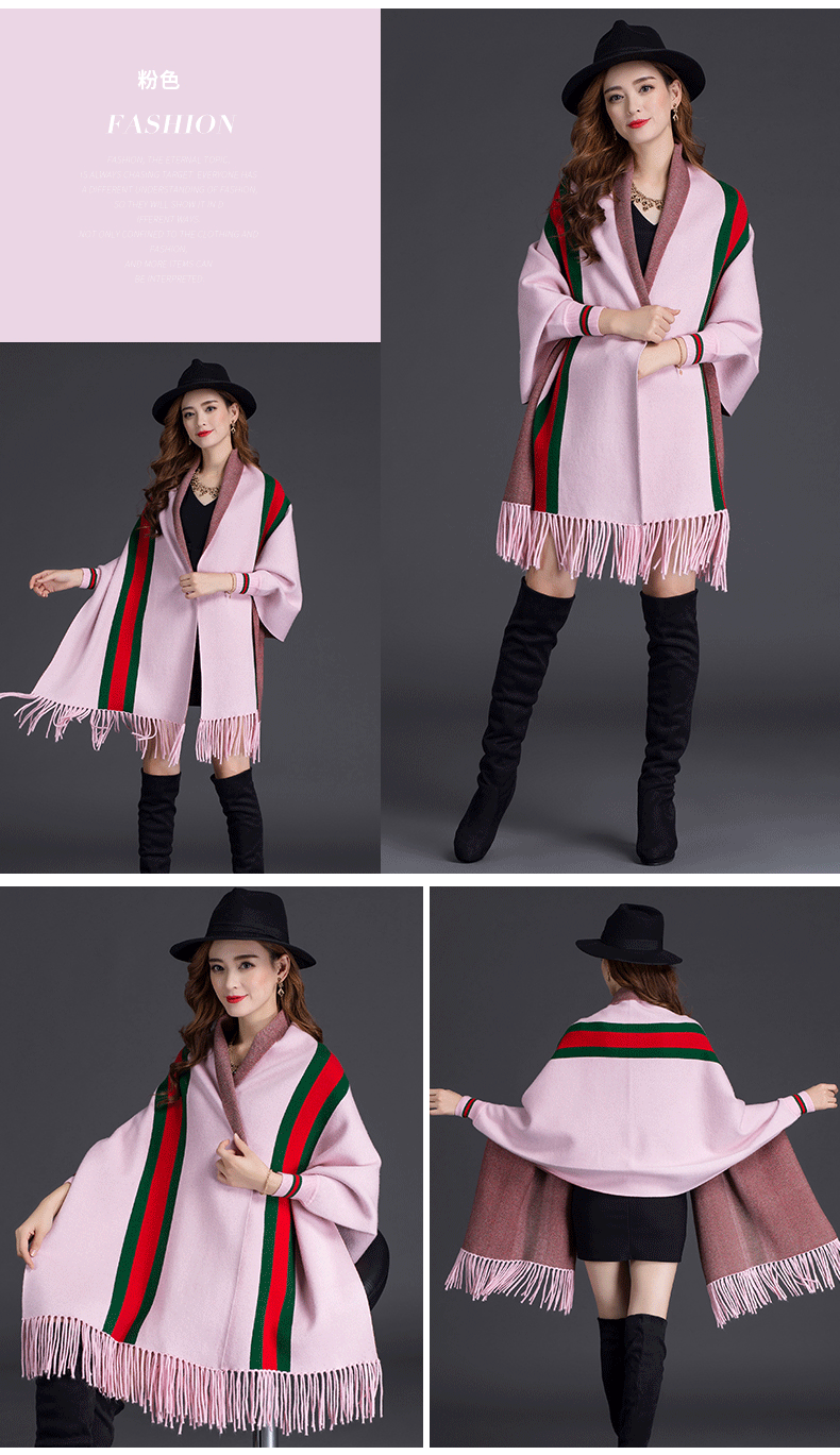 秋冬新款流苏条纹带袖披肩斗篷双面加厚外套女蝙蝠袖针织开衫披肩 English | 投诉