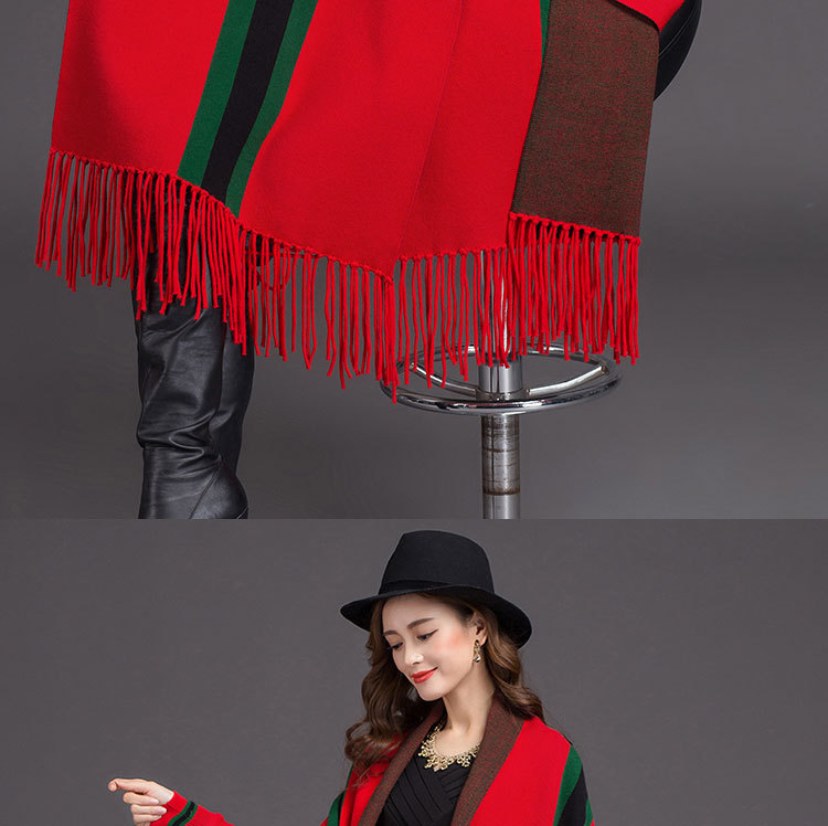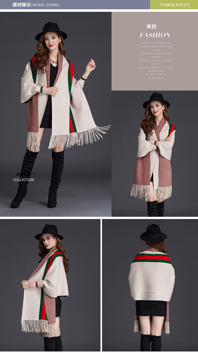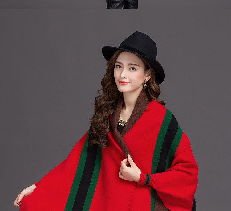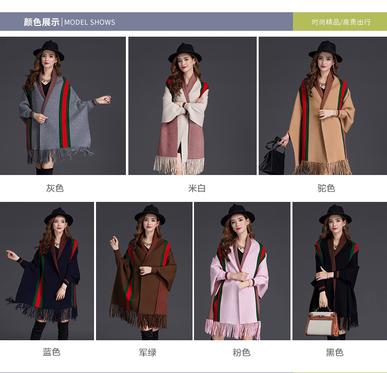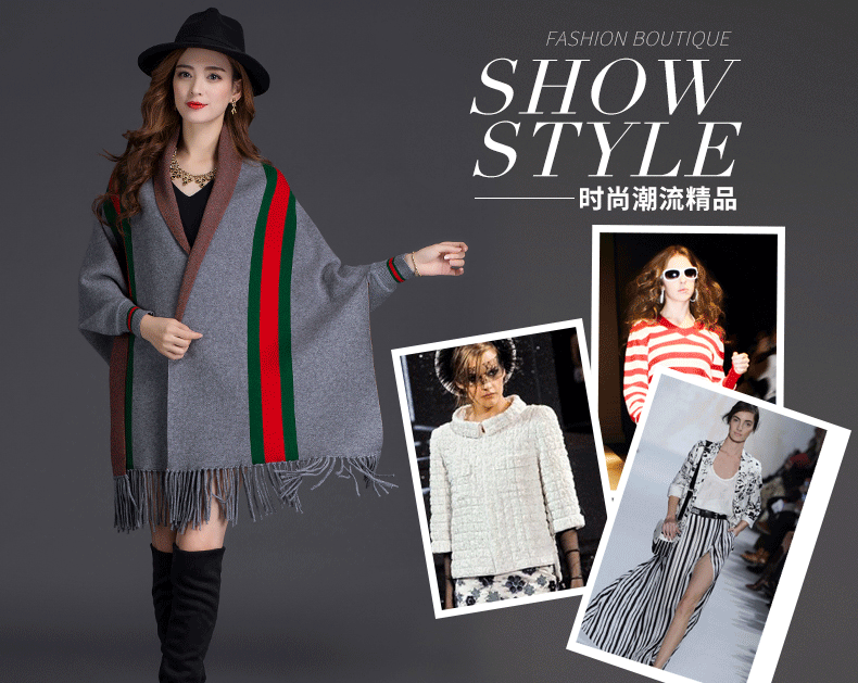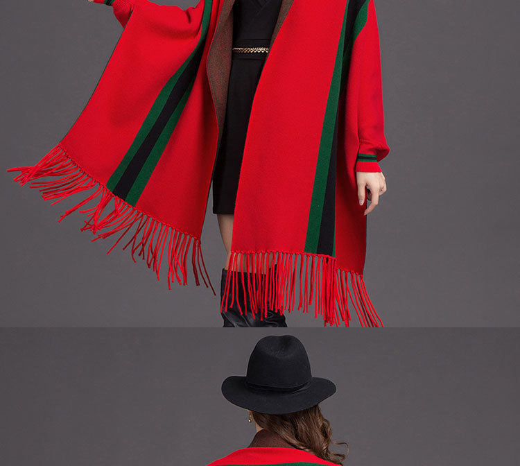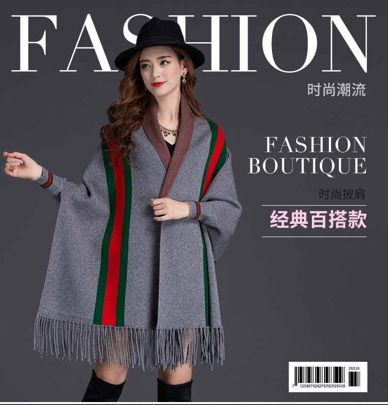 秋冬新款流苏条纹带袖披肩斗篷双面加厚外套女蝙蝠袖针织开衫披肩 English | 投诉