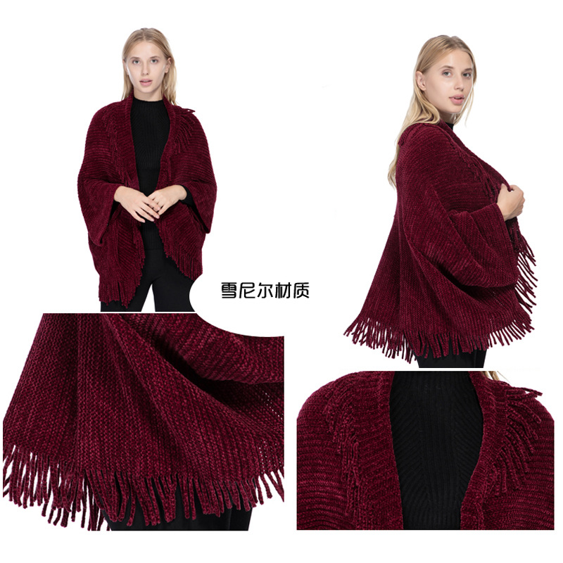 厂家直销外贸现货保暖针织披肩女秋冬新款雪尼尔腈纶流苏开衫斗篷 English | 投诉