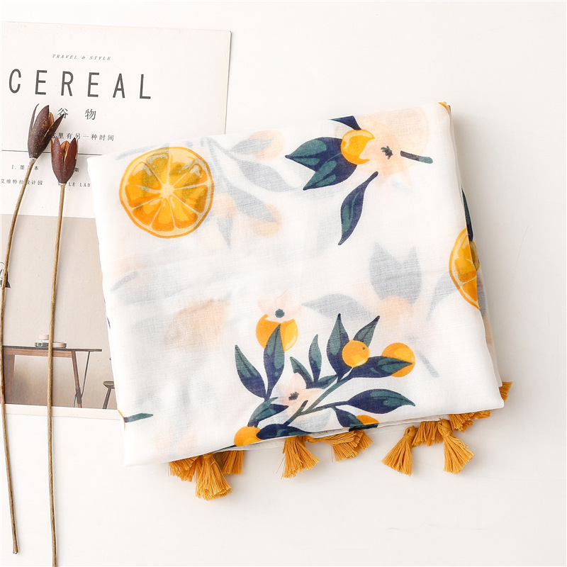 日韩甜美时尚水果橙子丝巾印花棉麻手感围巾流苏旅游防晒沙滩巾女 English | 投诉