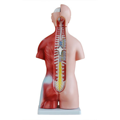 这是一款杰出的躯干模型,其特征是:脊椎露在外面,其中一段脊椎可拆下,一块女性胸腔盖和可互换的男女生殖器官,女性子宫中含有一胎儿,可分成23件:躯干,女性胸腔盖,头,眼球,脑,一块脊椎神经,肺(2件),心(2件),肝,肾,胃(2件),肠(4件),男性生殖器官(2件),女性生殖器官带胎儿(3件)。用PVC制成,安放在塑料坐上。尺寸85CM