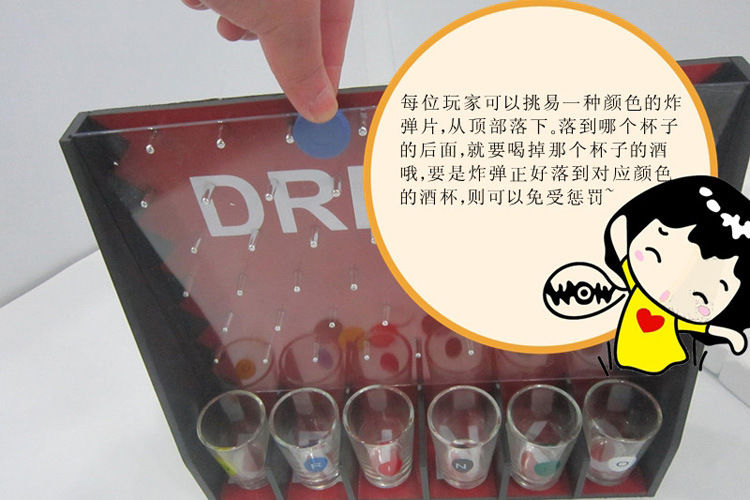 好玩有趣的投“炸弹”游戏如今在中国的酒吧已经随处可见了,不玩你就OUT了~~亲,你今天被“炸”了吗? 一共有6片“炸弹”,6个不同颜色的酒杯,每位玩家在开始游戏前先挑选一个颜色的“炸弹”,可以依次投递“炸弹”,也可以大家一起投, 最终小“炸弹”落在哪个杯子的后面,那么对应的玩家就要喝掉那个杯子里面的酒或其他饮料,或者是根据杯子中的纸条做出相应的惩罚, 要是“炸弹”落到相同颜色的酒杯中,则那位玩家可以不受惩罚~的了,还有其他的玩法可以玩家自己设定,没有局限哦,尽兴就好 嘿嘿,玩的就是心跳,玩的就是刺激,你还在观望吗?不要犹豫了,快来加入我们吧 杯子尺寸:高6.2CM,上口径:4.2CM,下口径3.2Cm 产品尺寸:约31*28*9CM |