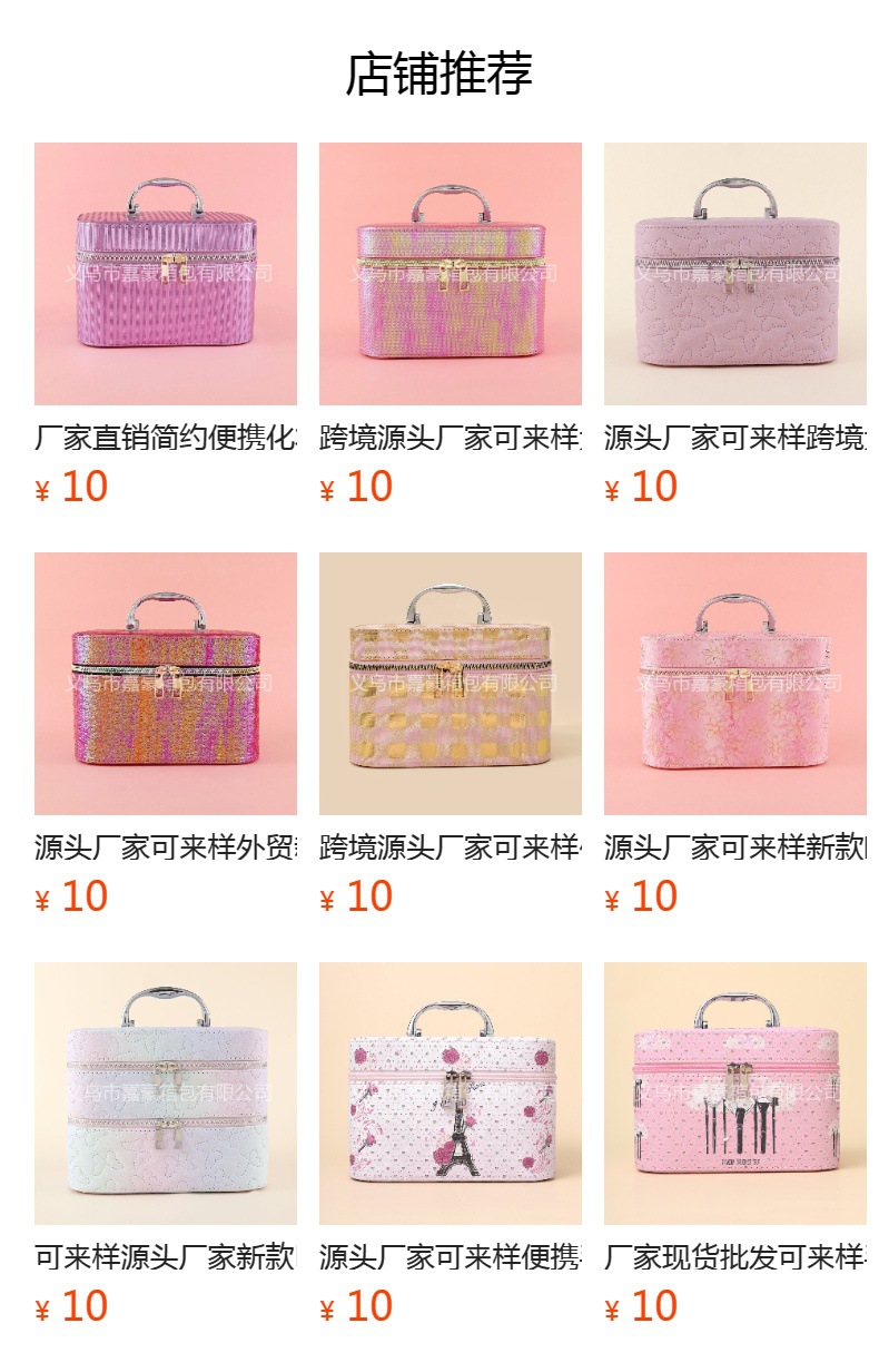 • 义乌嘉豪箱包有限公司市是集生产、加工、销售为一体的现代化企业,商铺坐落于义乌国际商贸城4区75号门2楼1街34301,主营化妆箱包,收纳箱,化妆包,竭诚为您服务,欢迎采购!