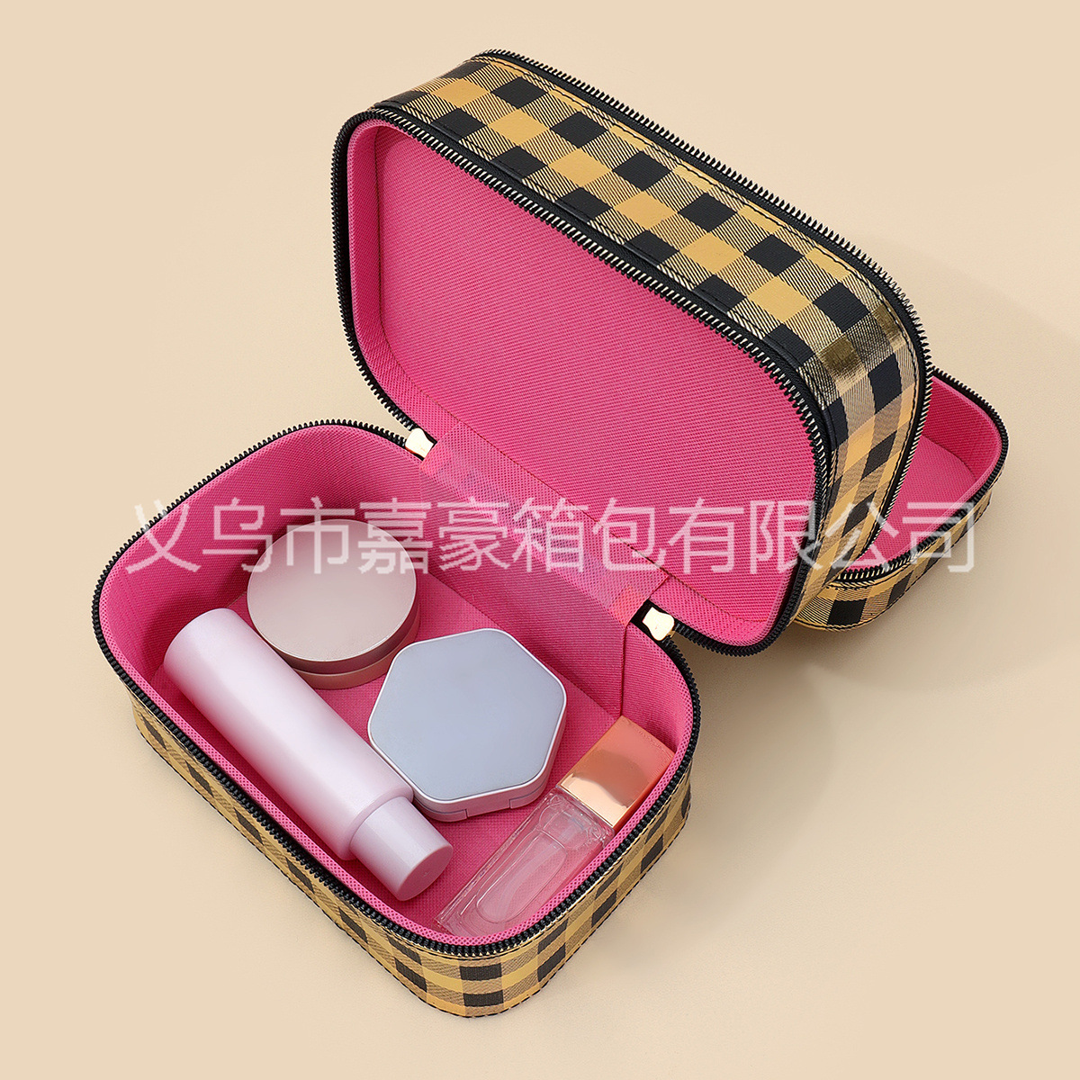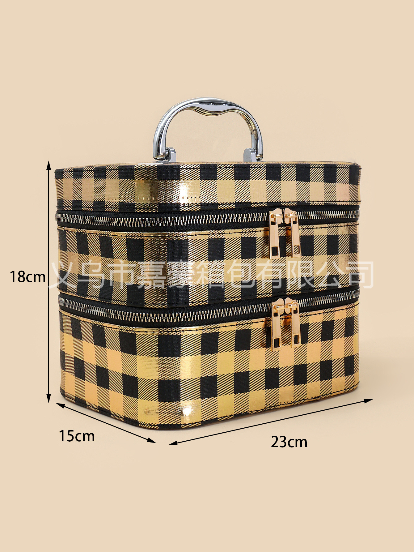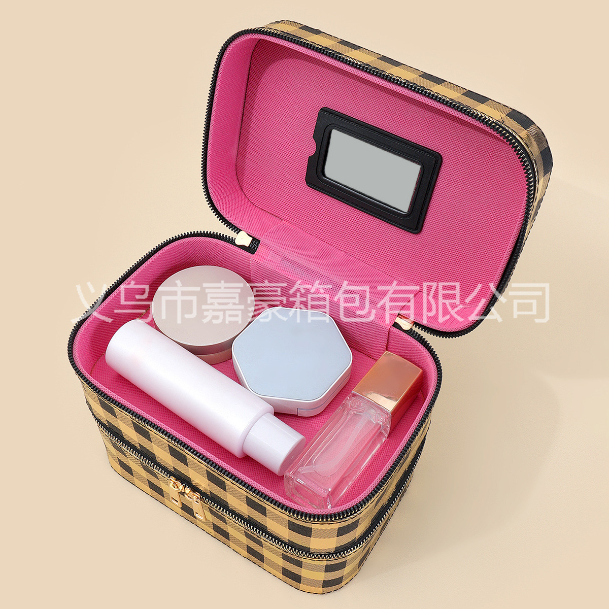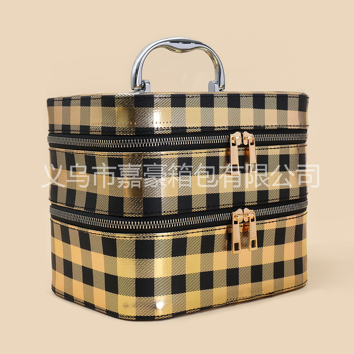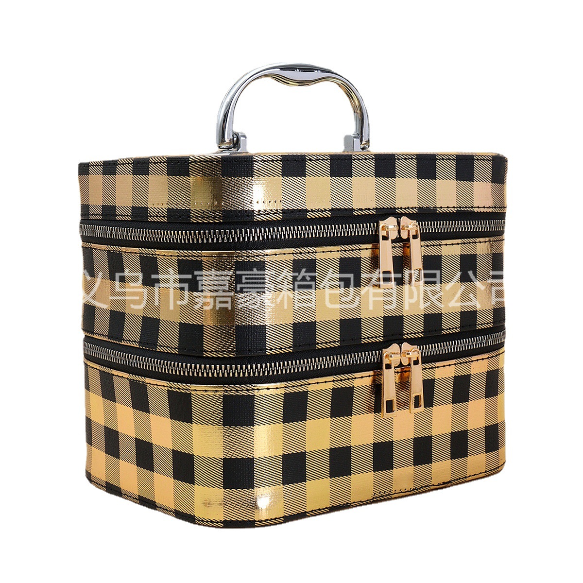 源头厂家可来样生产便携手提大容量颜值烫金黑方格化妆箱外贸爆款