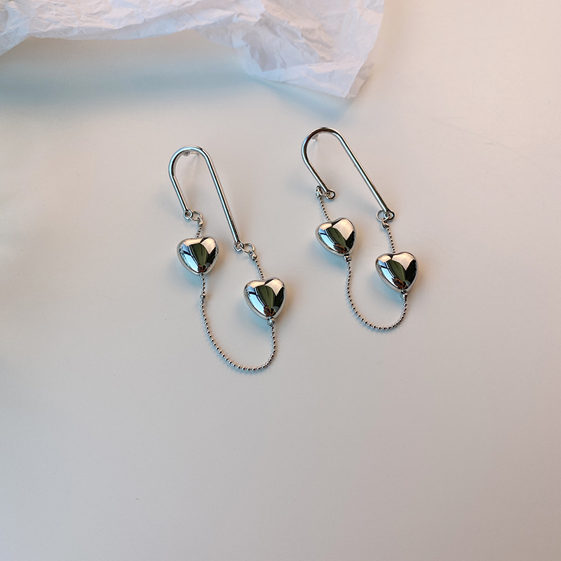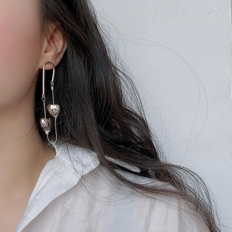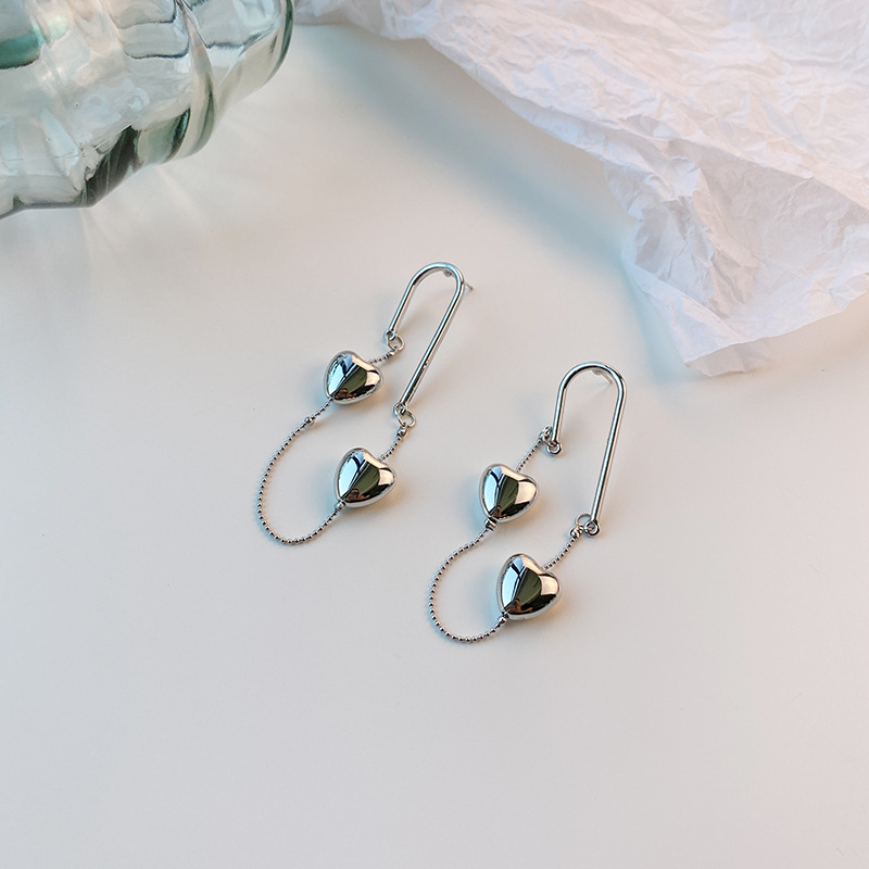 银色双爱心流苏耳钉长款独特设计感ins风耳环立体显瘦耳饰品批发 English | 投诉