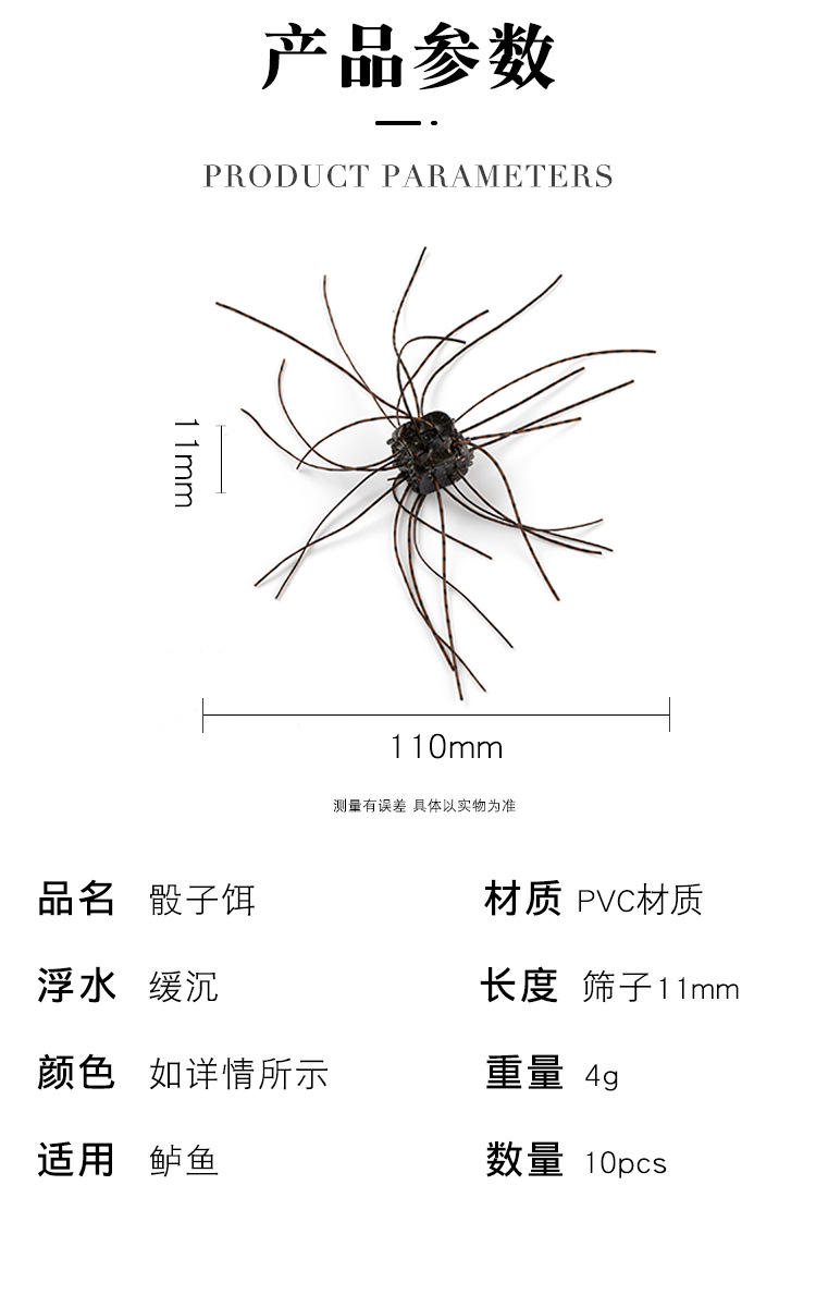 | 黑色:骰子饵成品10个装/包 | ¥1800 | 999999个 |