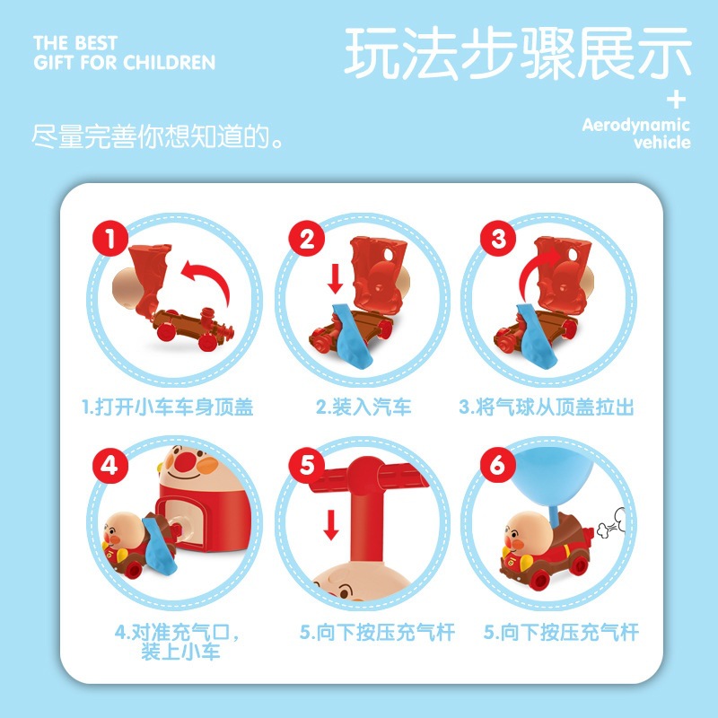 超级好玩 无需电池 利用空气动力学的反作用原理推动小车 只要手压充气 按下GO键 小车就飞速跑起来 锻炼手眼协调能力 附10个彩色气球和两辆面超小车