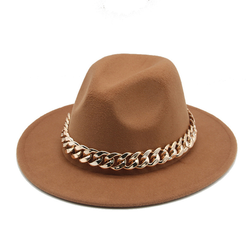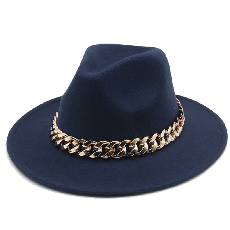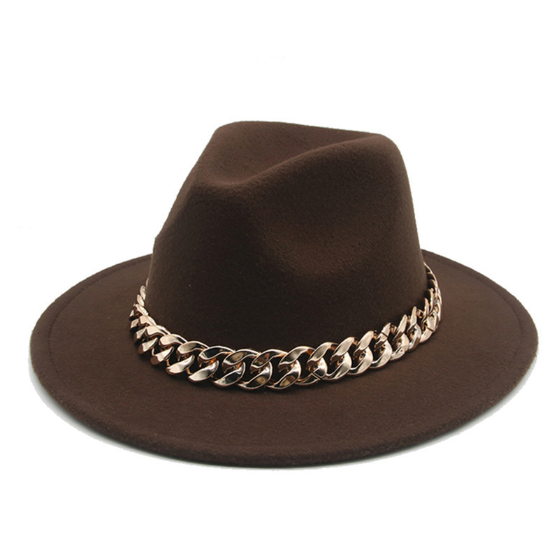 秋冬金项链毡帽英伦欧美平檐大檐爵士毛呢礼帽跨境外贸 投诉