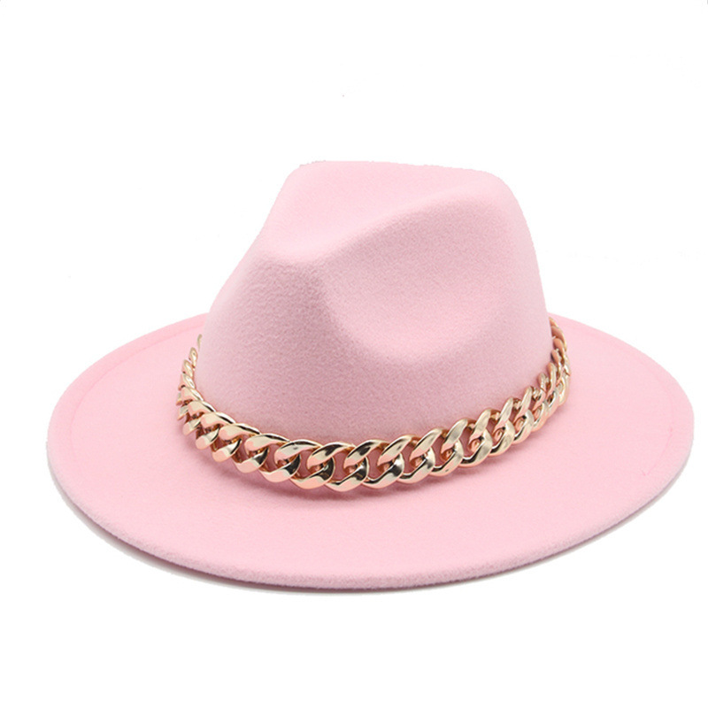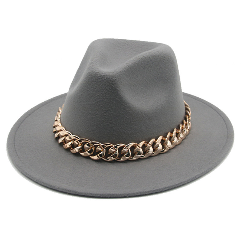 秋冬金项链毡帽英伦欧美平檐大檐爵士毛呢礼帽跨境外贸