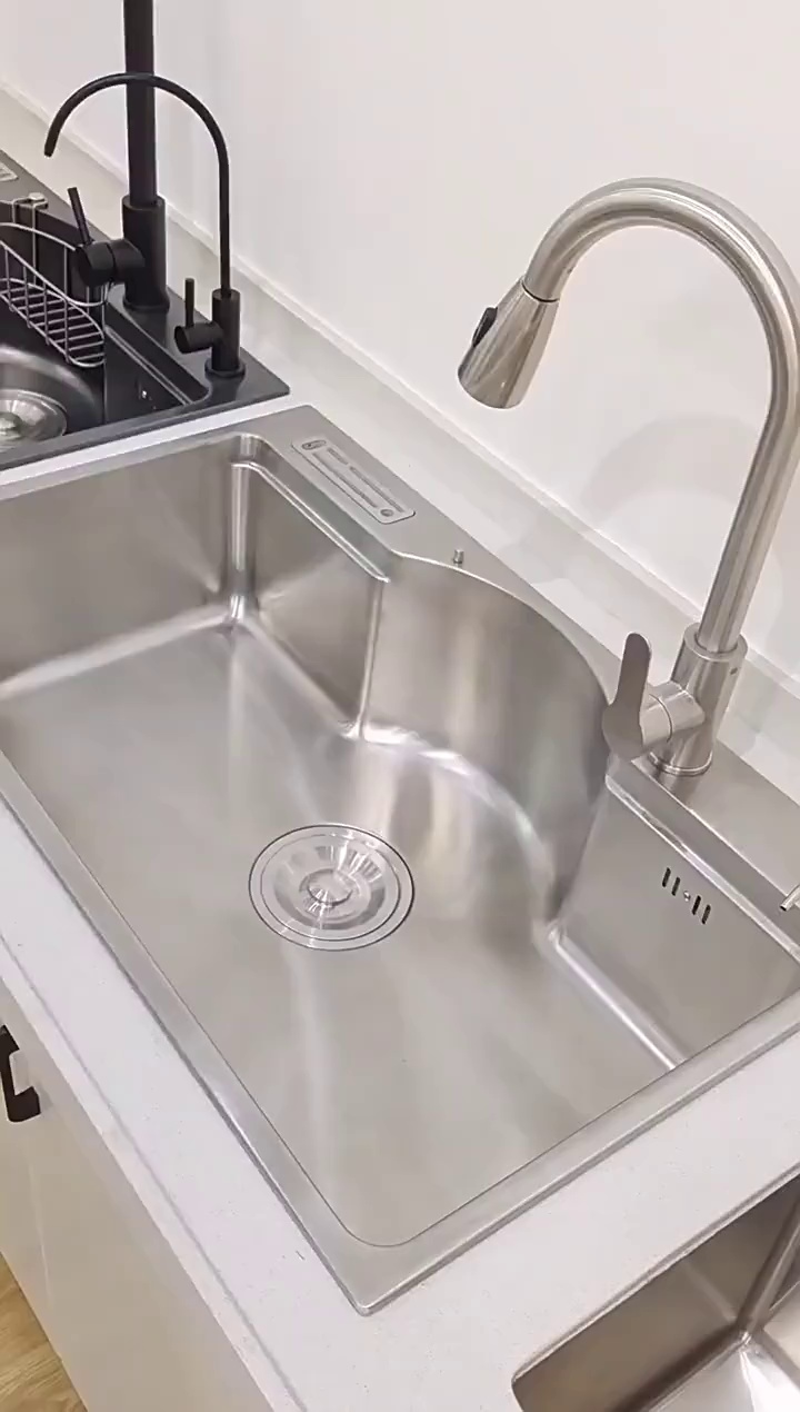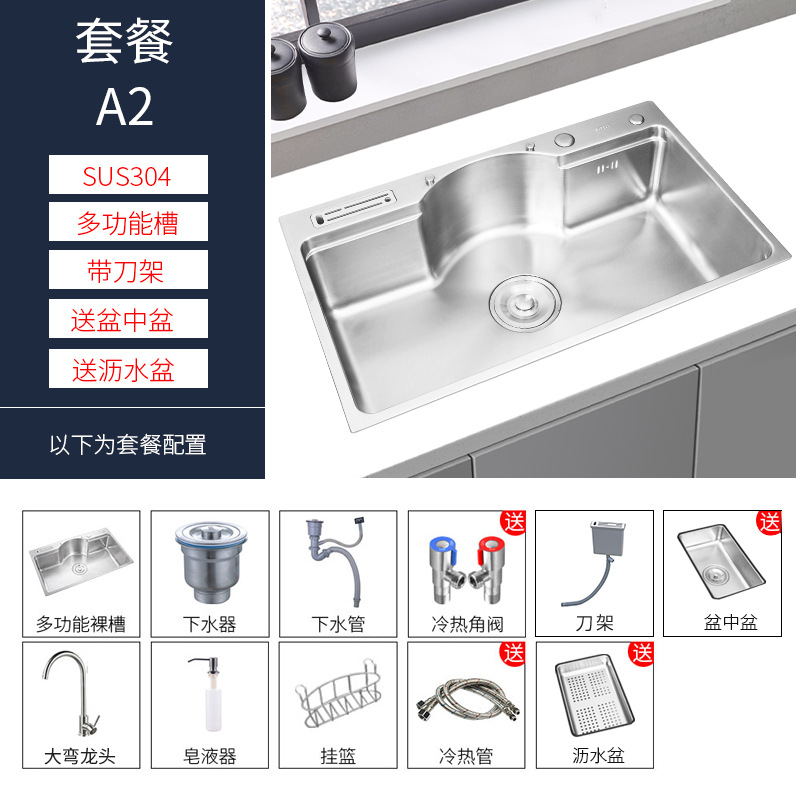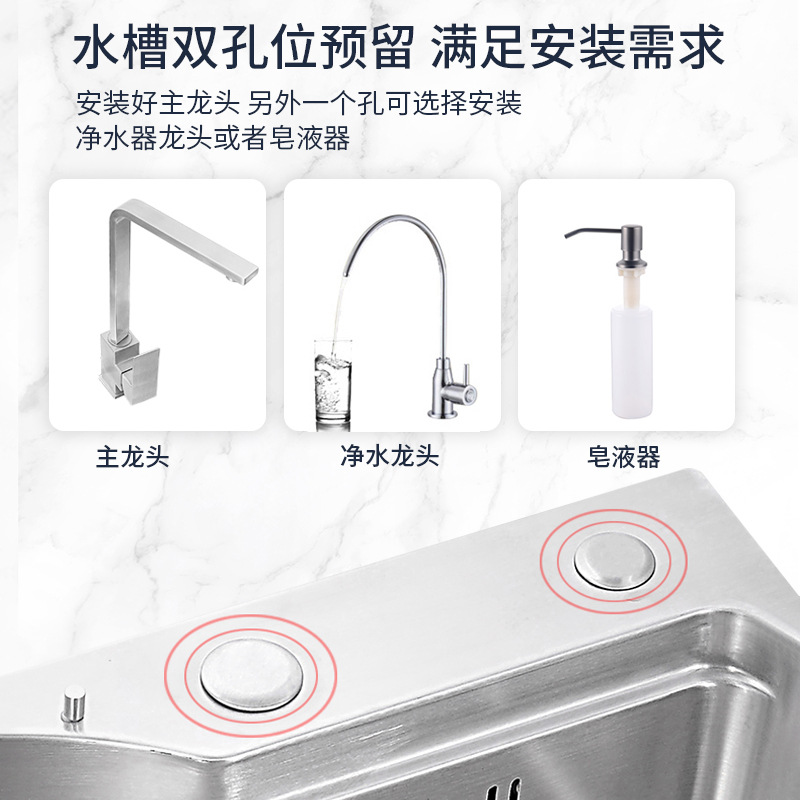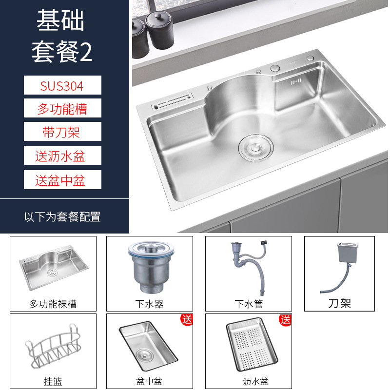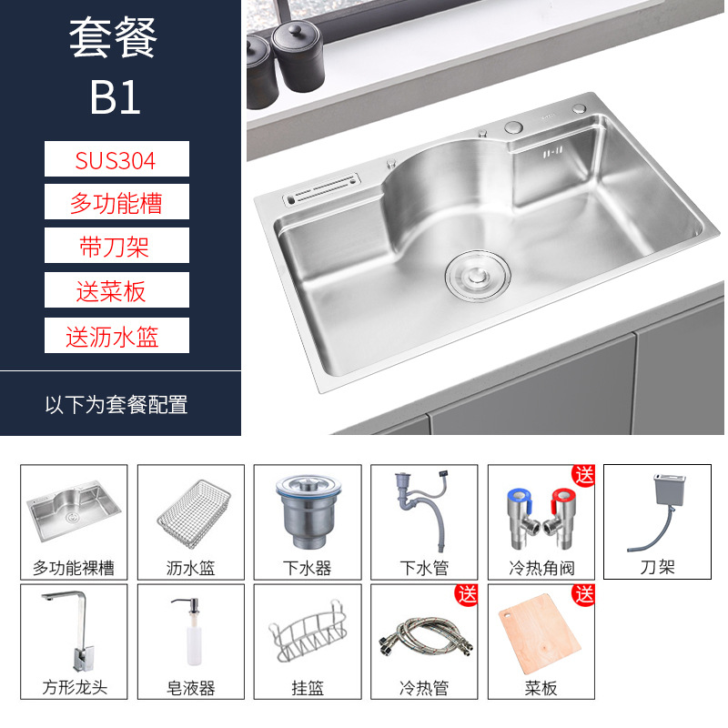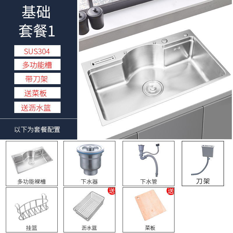 这款水槽是多功能日式大单槽(水槽尺寸有78*48*22CM)有不锈钢原色和纳米黑色两种颜色,台面开孔尺寸75*45,水槽配件等齐全