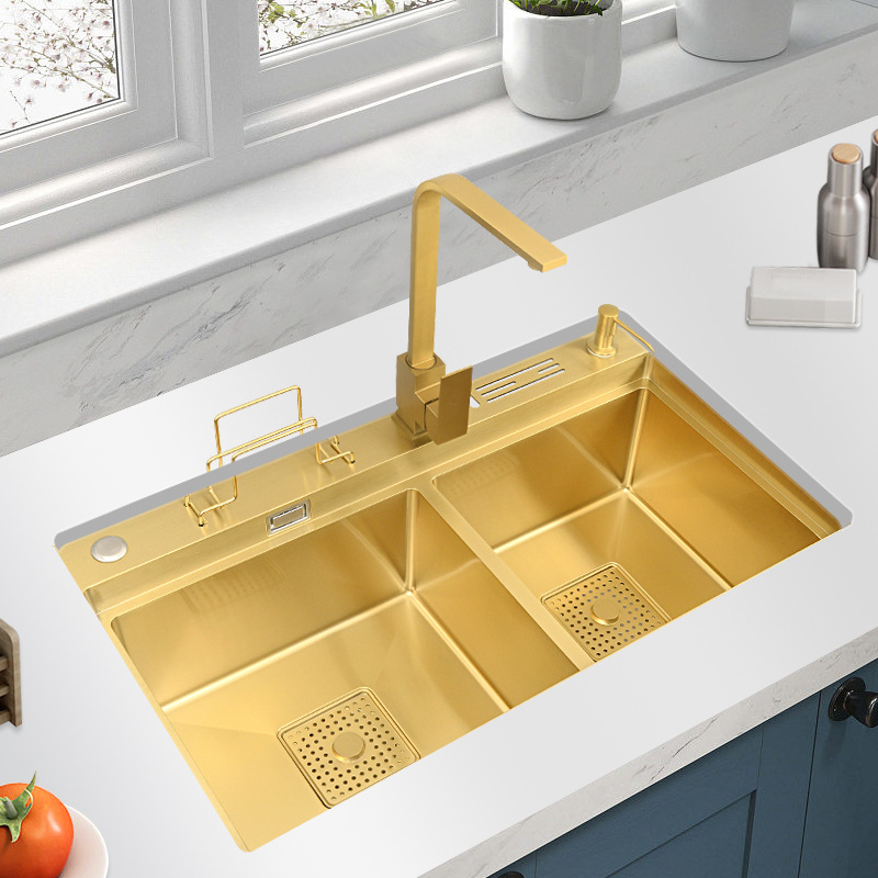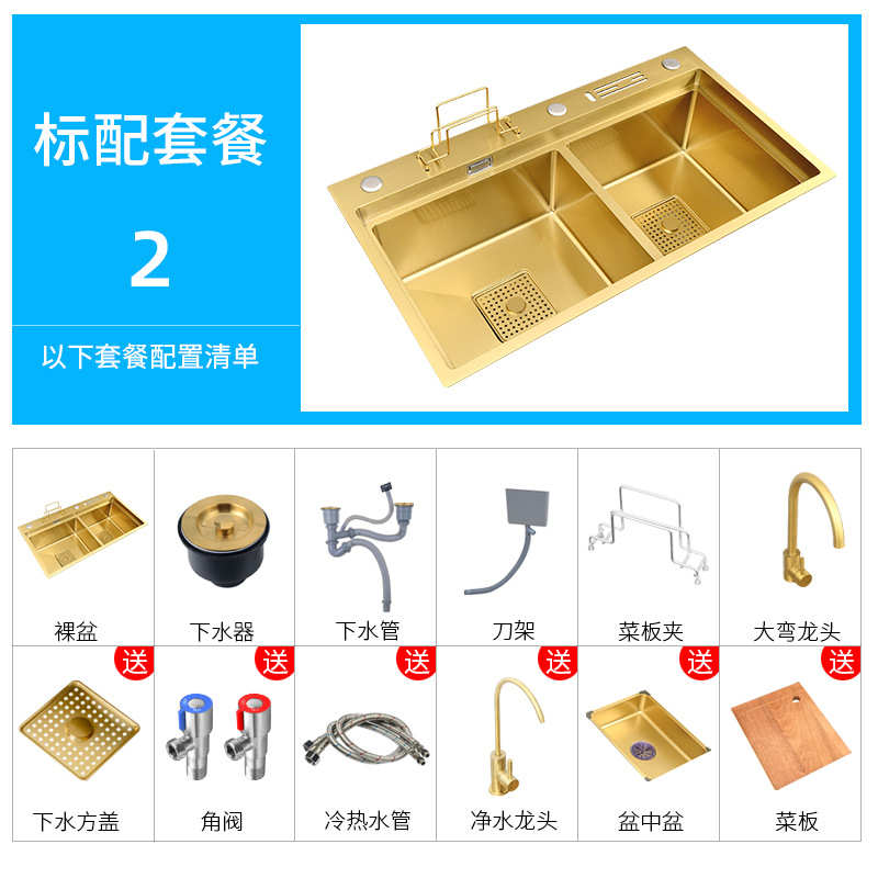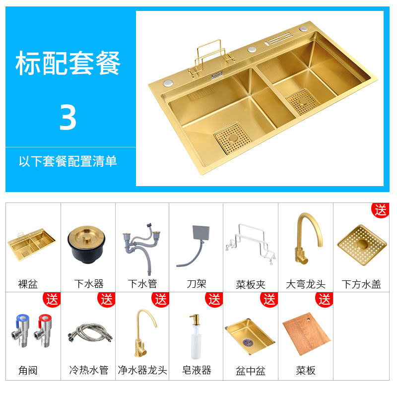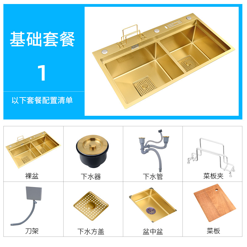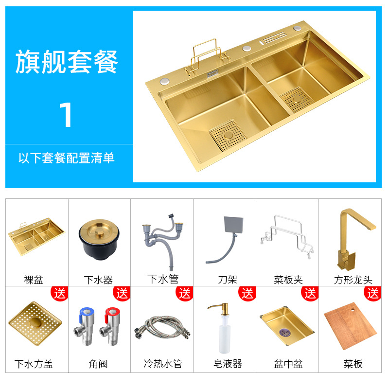 这款水槽是用料加厚4MM纳米金色手工双槽,(水槽尺寸有7846/8246/两个尺寸-台面开孔尺寸长宽各减3cm,水槽配件等齐全【量大可根据客户需要定做】