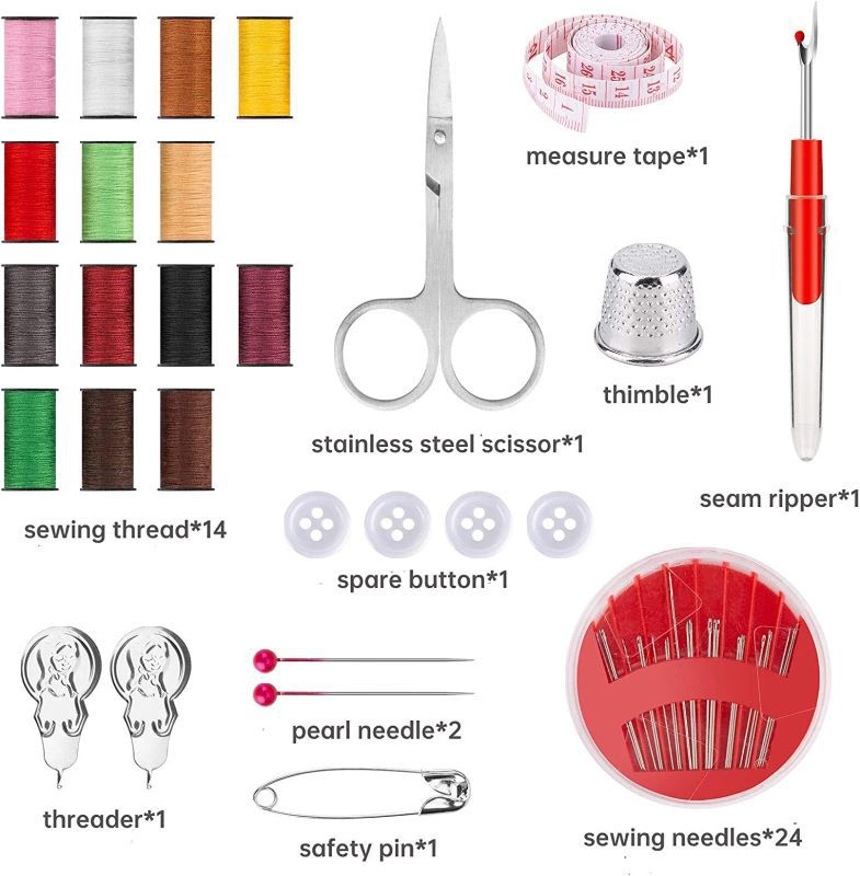 配件:彩色线圈*14、皮尺*1、金属顶针*1、拆线刀*1、剪刀*1、别针1、珠光针*2、白扣*3、引线器*2、针盘(24枚)*1、珠光针盘(40枚)*1、收纳包*1