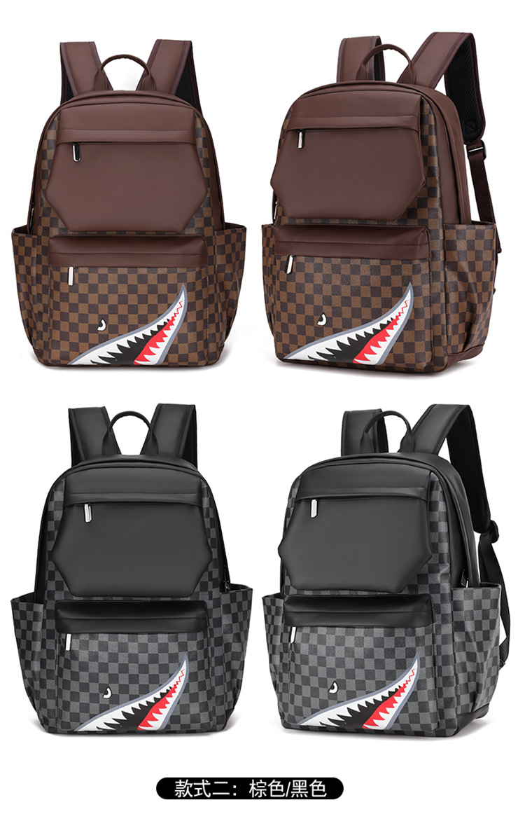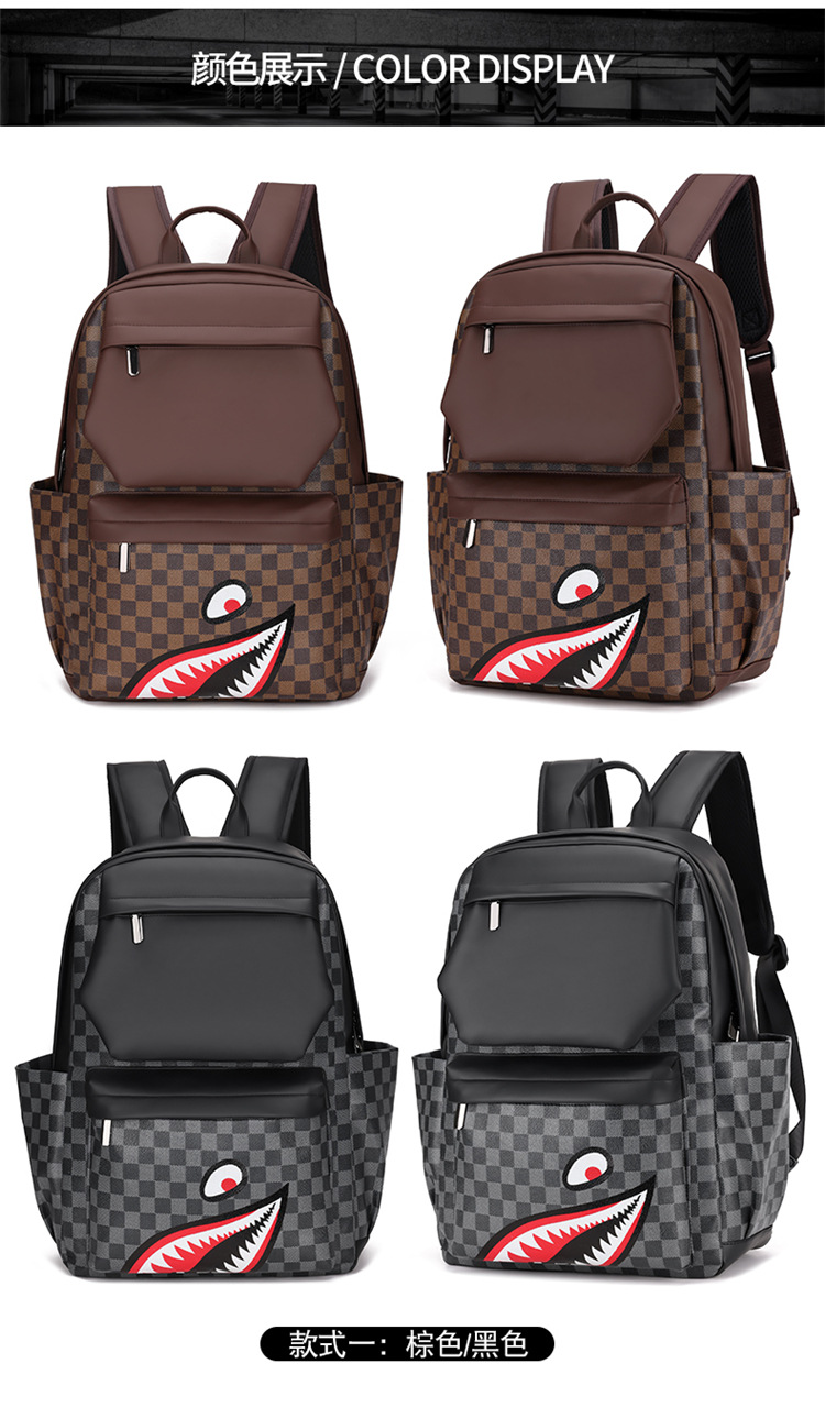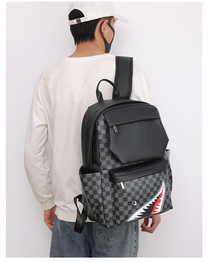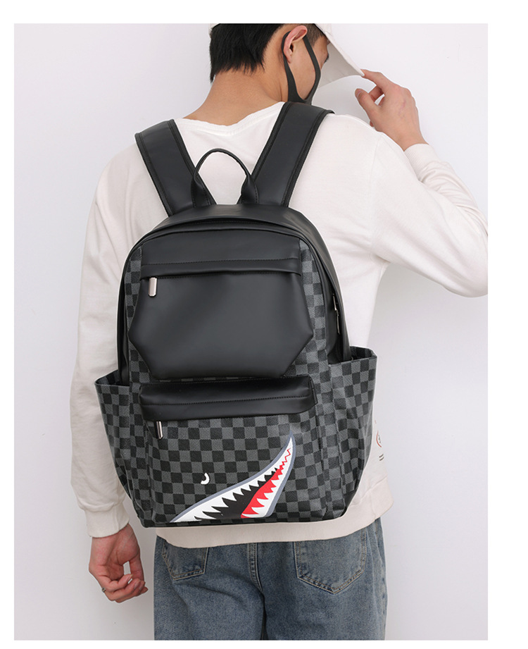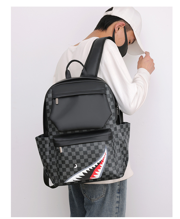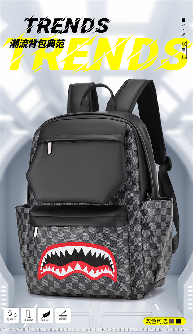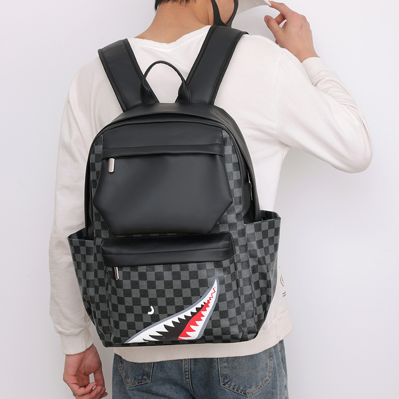 跨境潮流鲨鱼背包时尚经典格子男士双肩包户外休闲旅行收纳包男包
