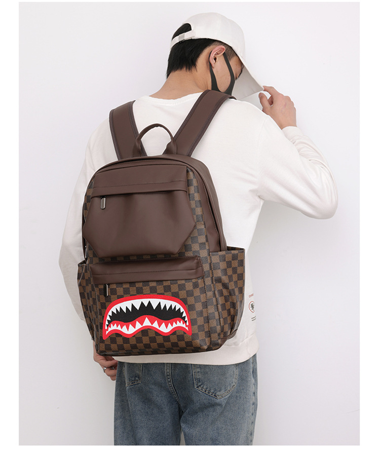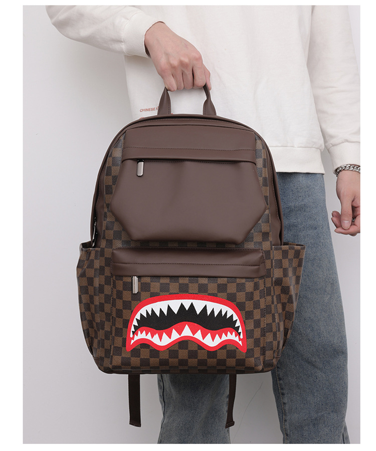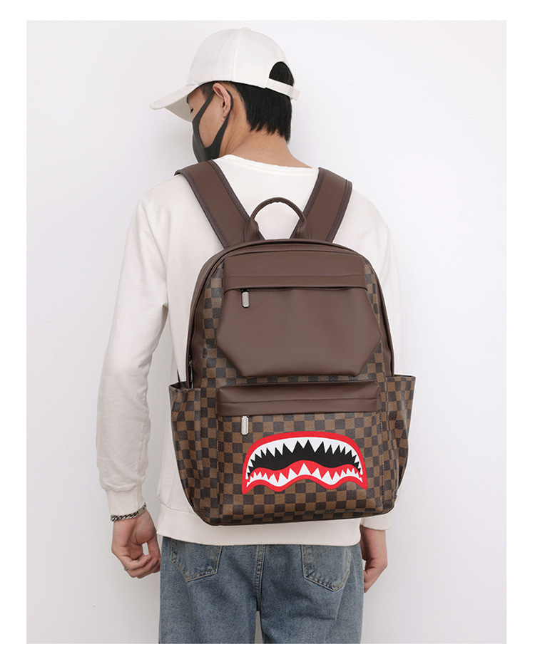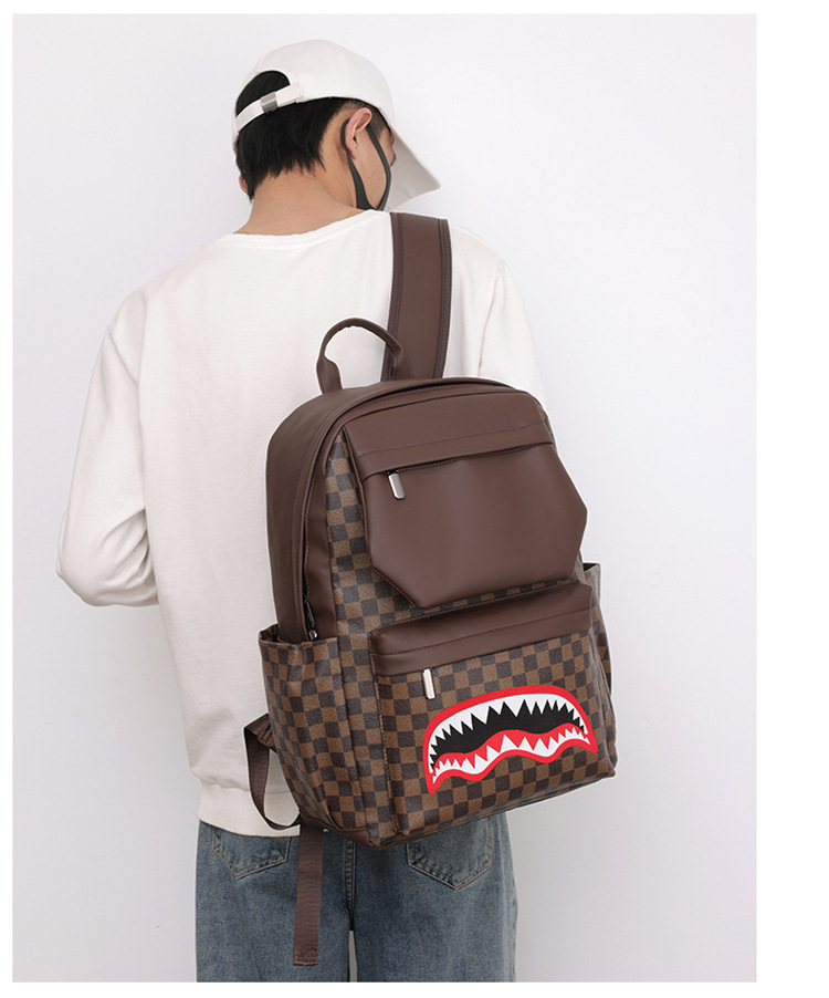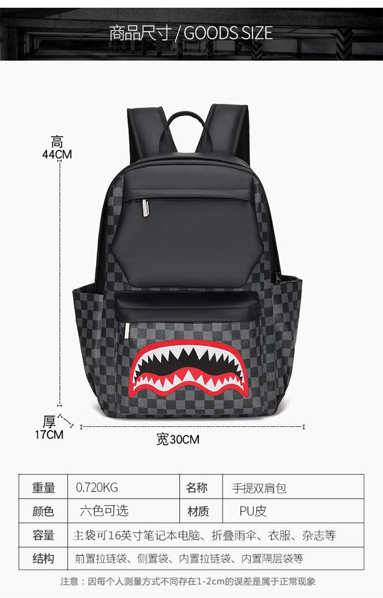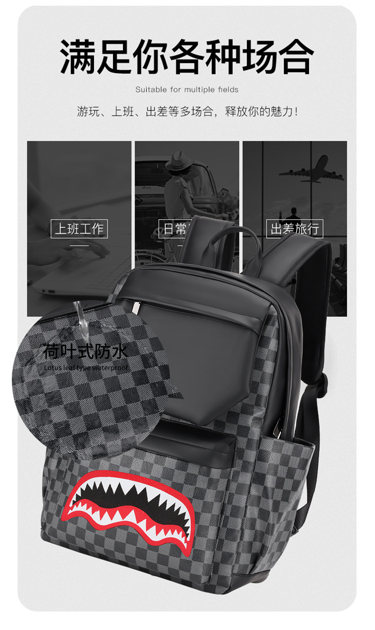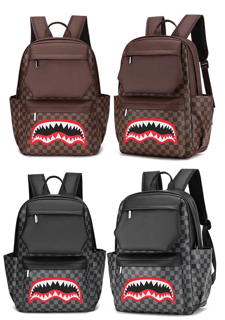 跨境潮流鲨鱼背包时尚经典格子男士双肩包户外休闲旅行收纳包男包