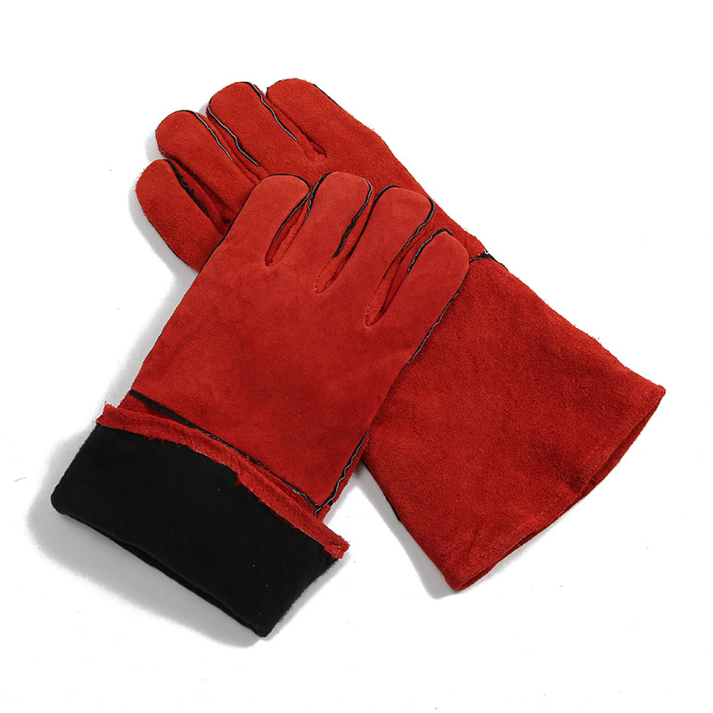 【产品描述】 焊工手套, 抗热皮质, 手部棉绒衬里,袖口全棉衬里, 滚边接缝。抗热牛皮,